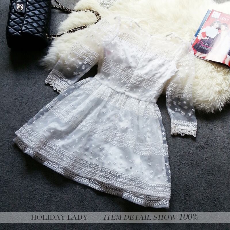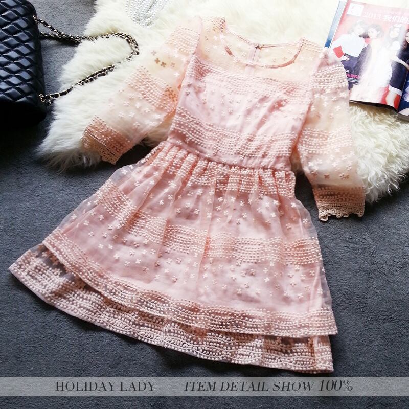 レースラウンドネックドレス レッド 刺繍 大人ガーリー スウィート キュート カジュアル Oネック ヨーロピアン 19784716211