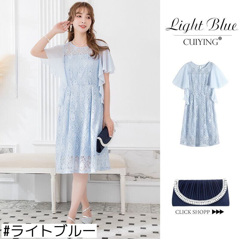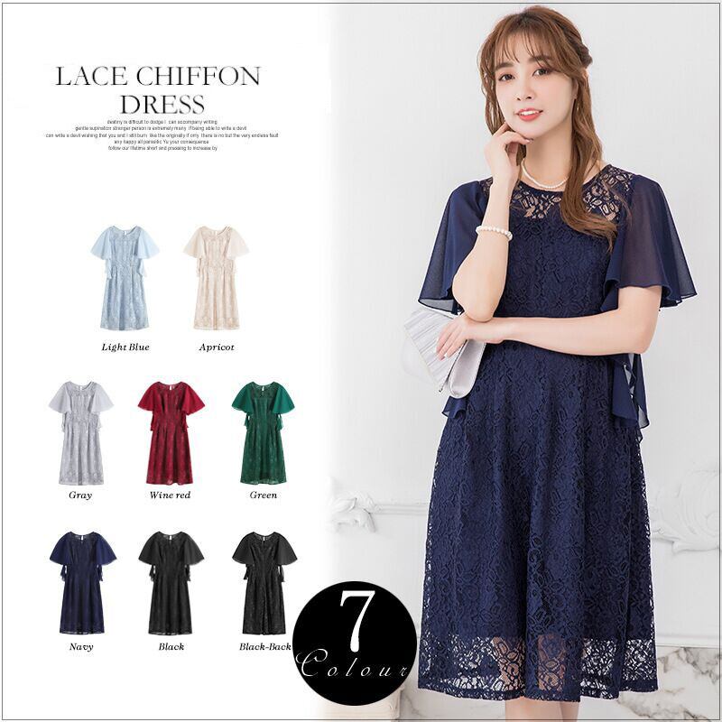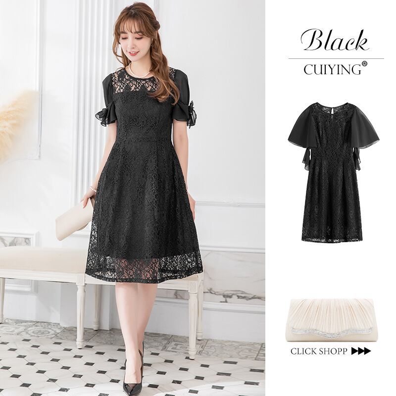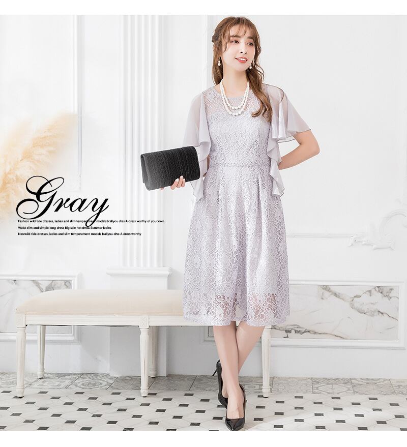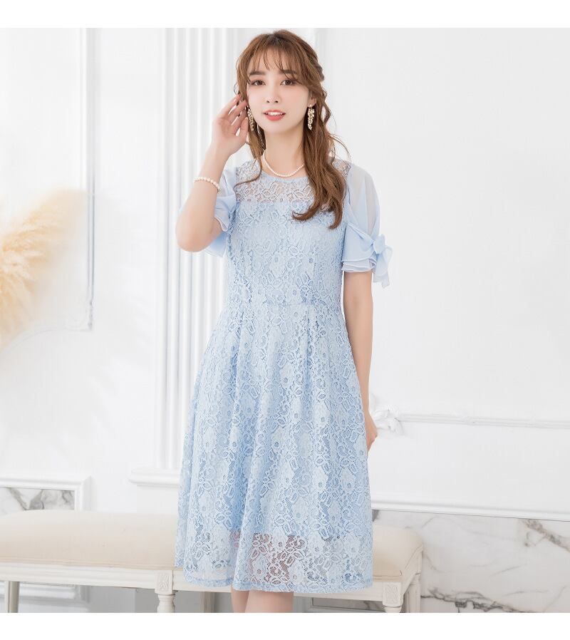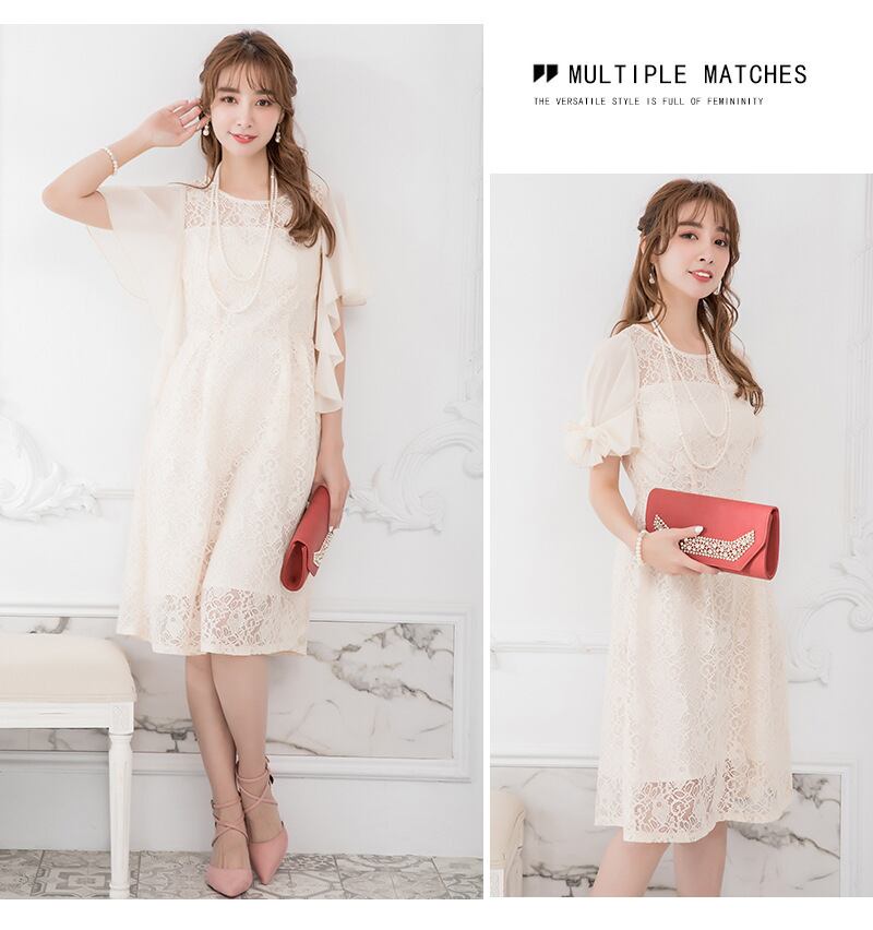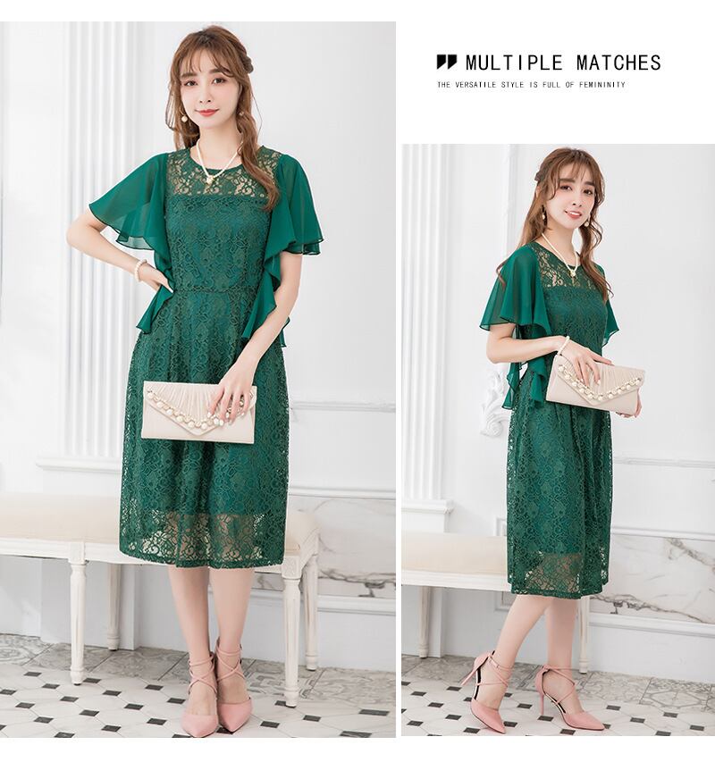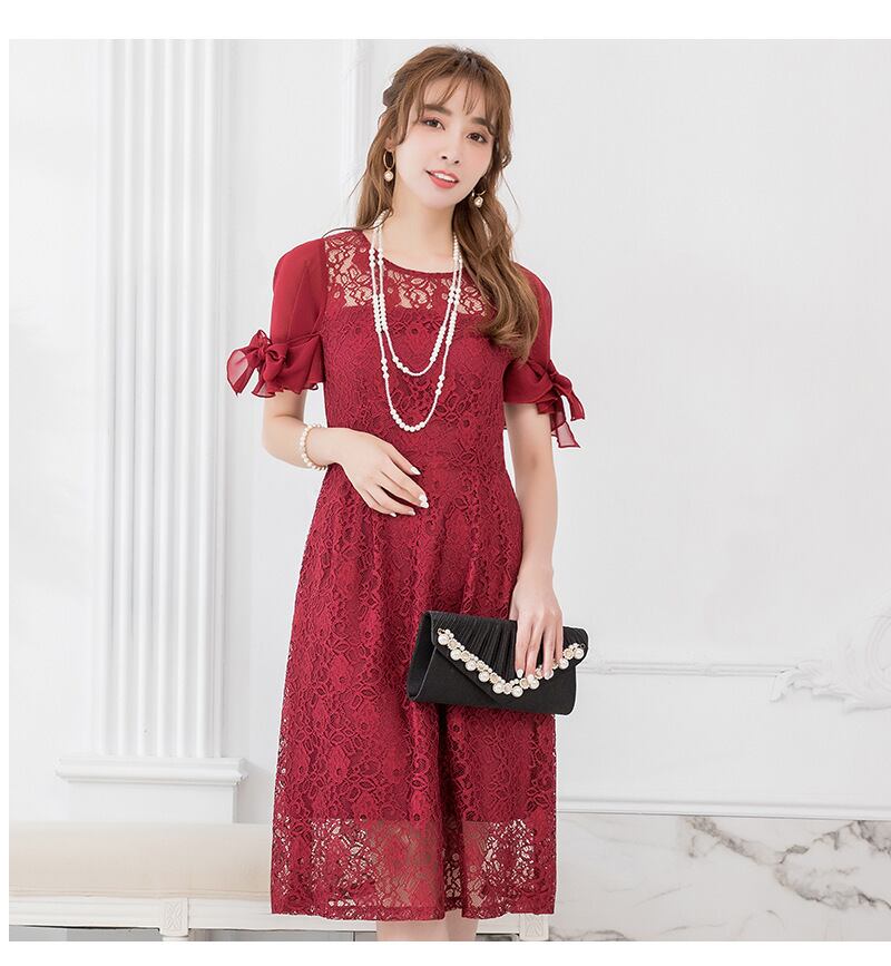 ラウンドネックレースFlowerデザイン シフォンスリーブワンピース レッド エレガント Oネック フラワーデザイン ステッチ 19789780894