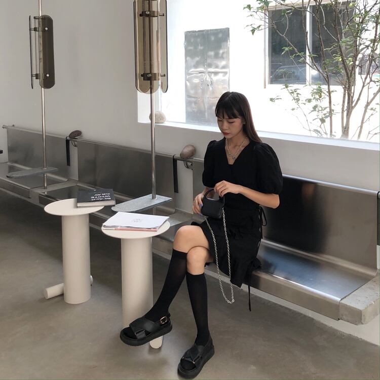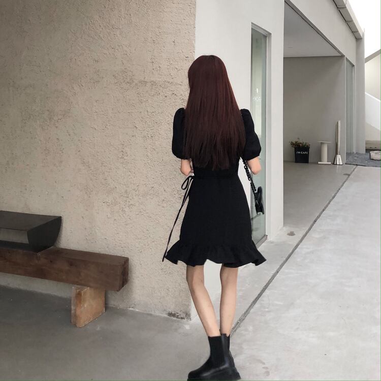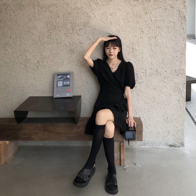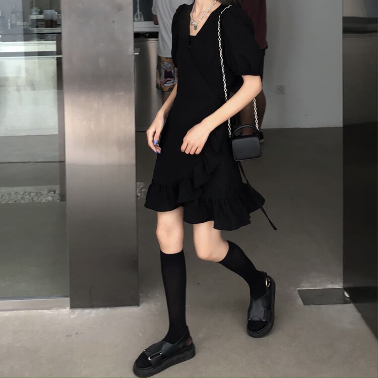 ブラックワンピーススタイルスタンダードVネック夏服 レトロ 夏物 Marchs79706960333