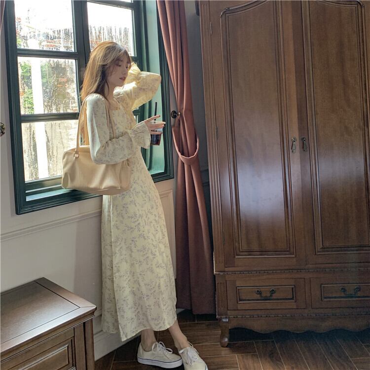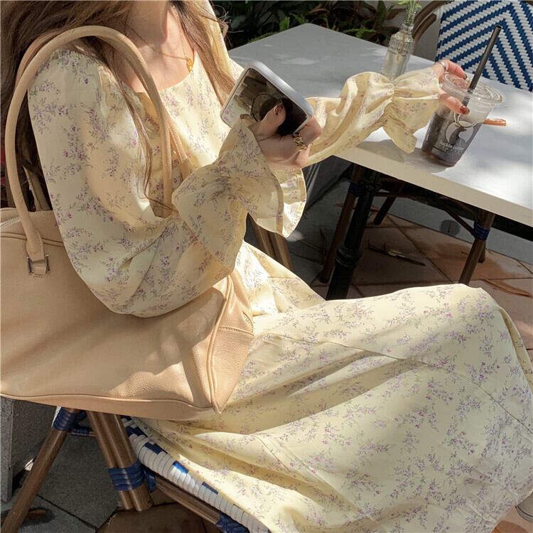スタンダードフローラルスカート レディーススプリング秋物韓国ファッションウェストロングカラーワンピース レトロ 春物 オータム 花柄 スクウェア スタイル ウエスト Marchs89658096322