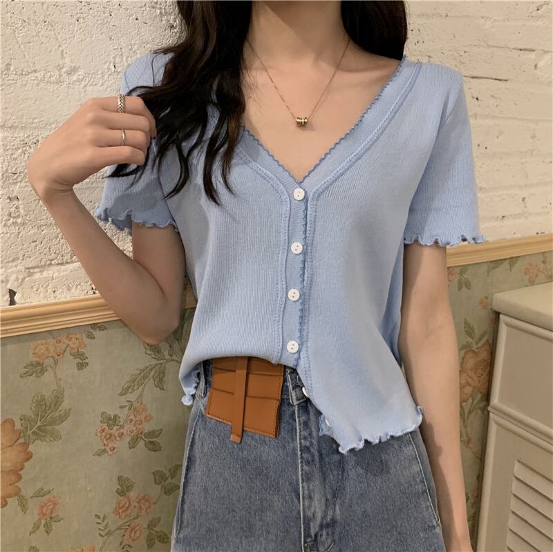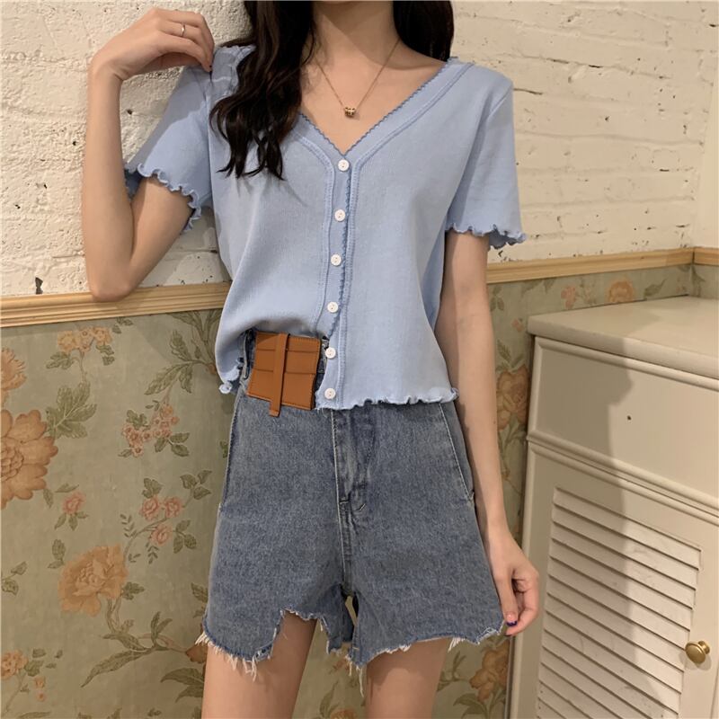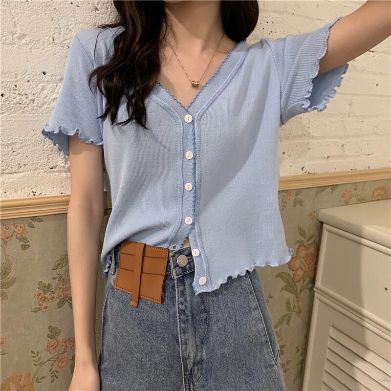 ショートトップス ハイウェストVネックニットカーディガン薄手夏服 夏物 ウエスト Marchs20922258571