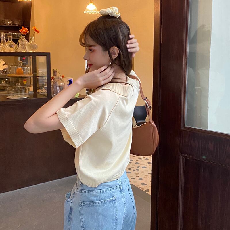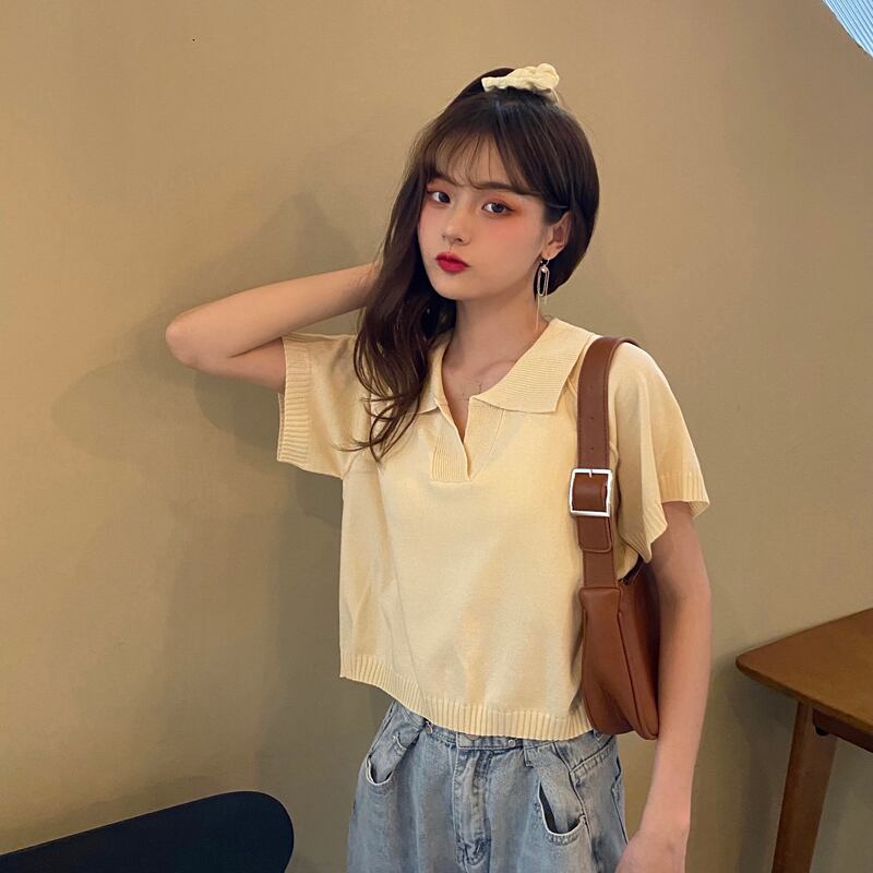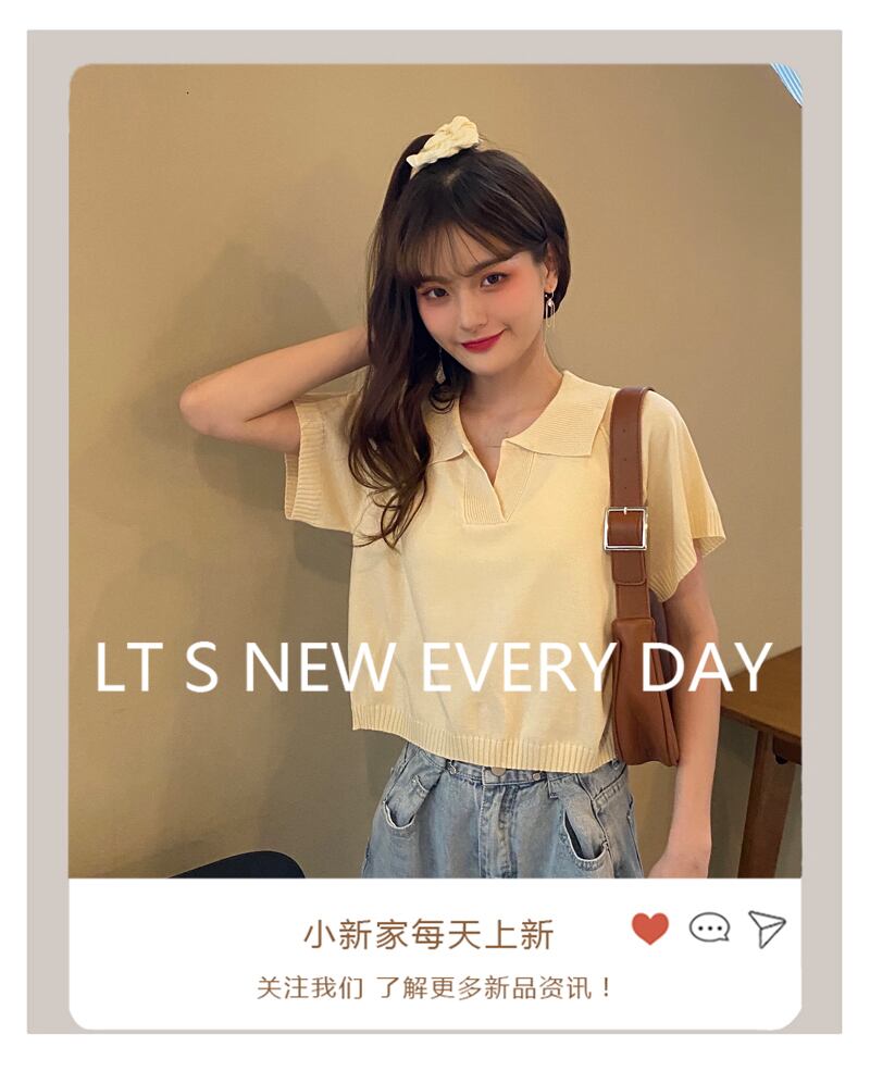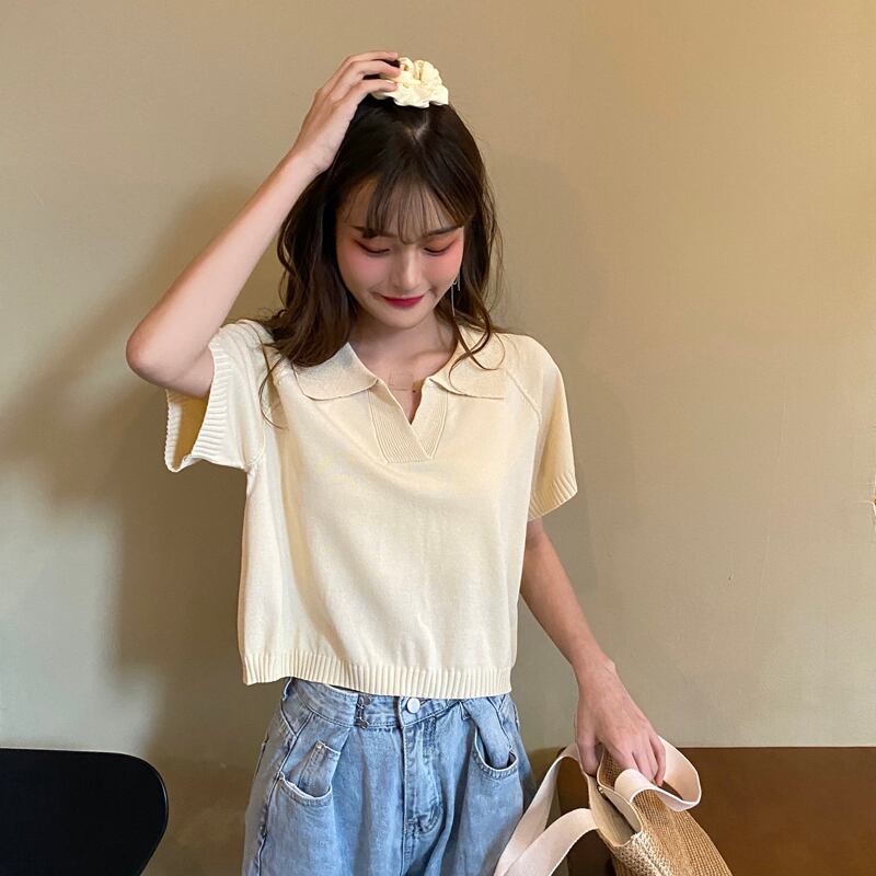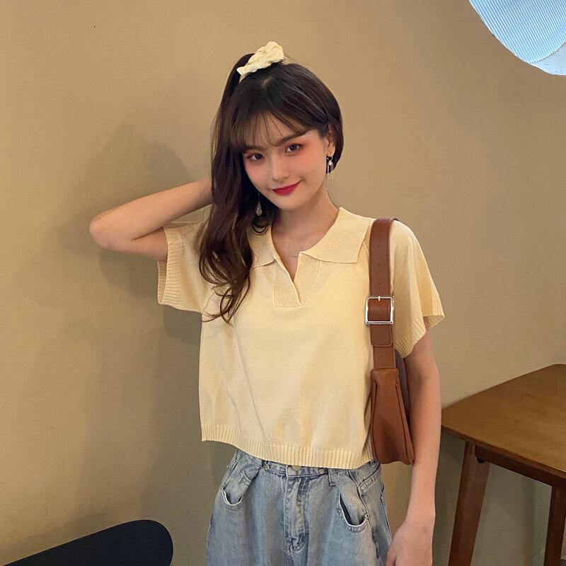 スタンダードニットカラーハイウェストウェストショートトップス 夏服ルーズトレンド半袖スリーブTシャツレディース レトロ ハーフスリーブ 夏物 ウエスト Marchs19617557012
