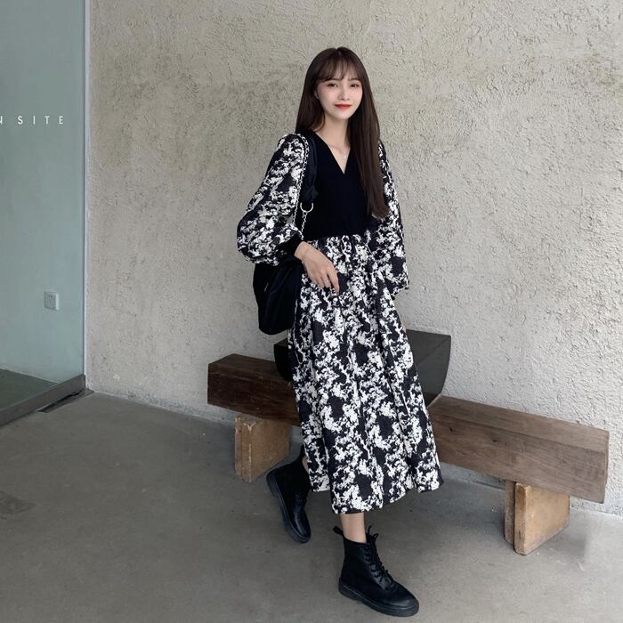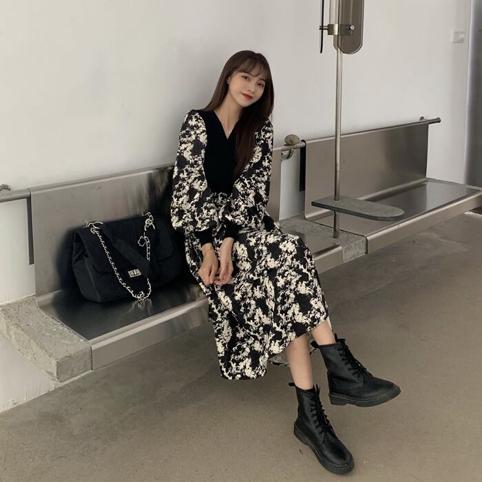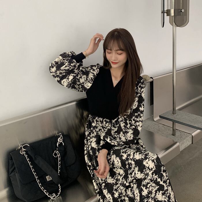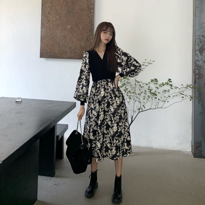 スタイルワンピーススタンダードニットスリーブ レトロ ステッチ ミドル丈 Marchs70323118596