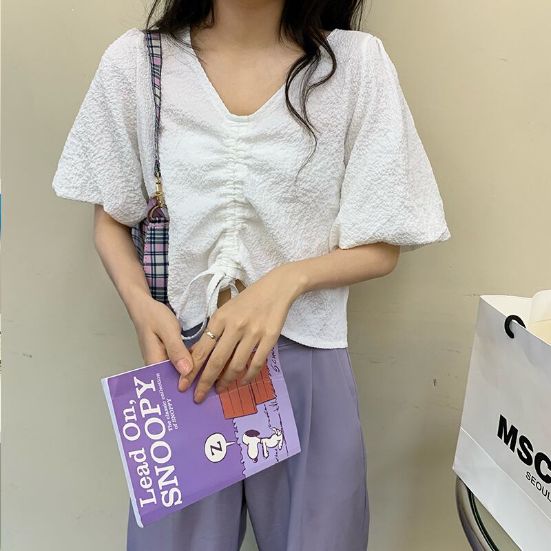 ショートレディーストレンドVネック夏服ブラウス ギャザーシャツ 夏物 Marchs80338950987