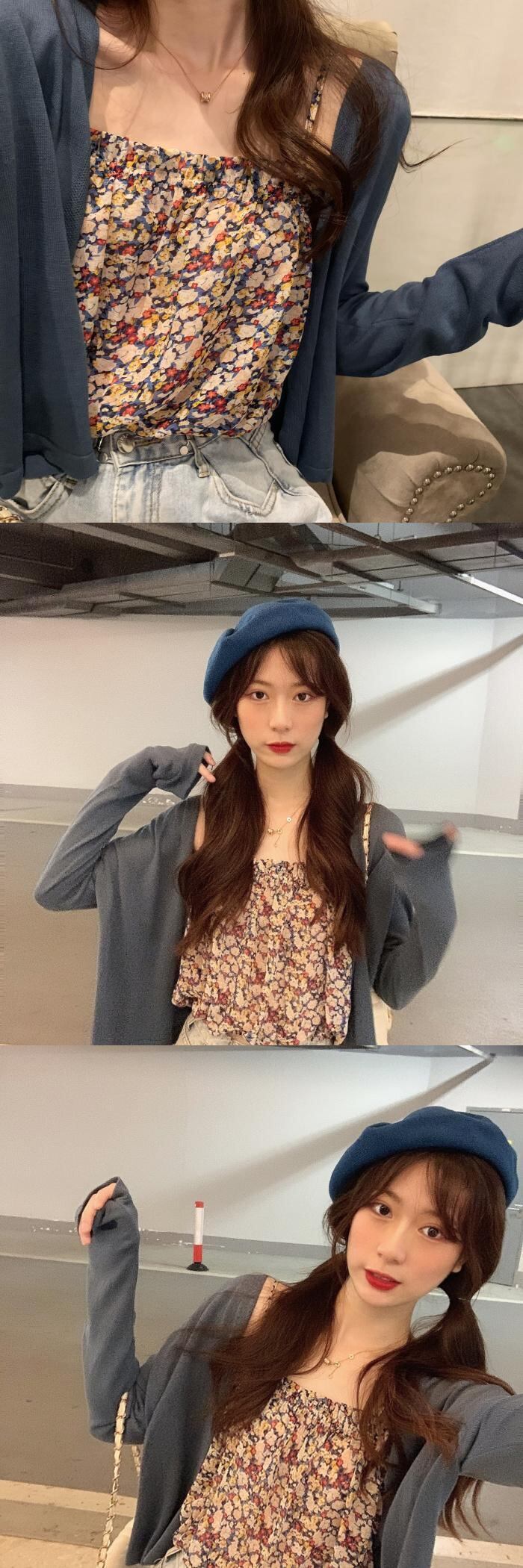 色:ピンクフローラルストラップ,ブルーフローラルストラップ,ワインレッドカーディガン,ブルーカーディガン