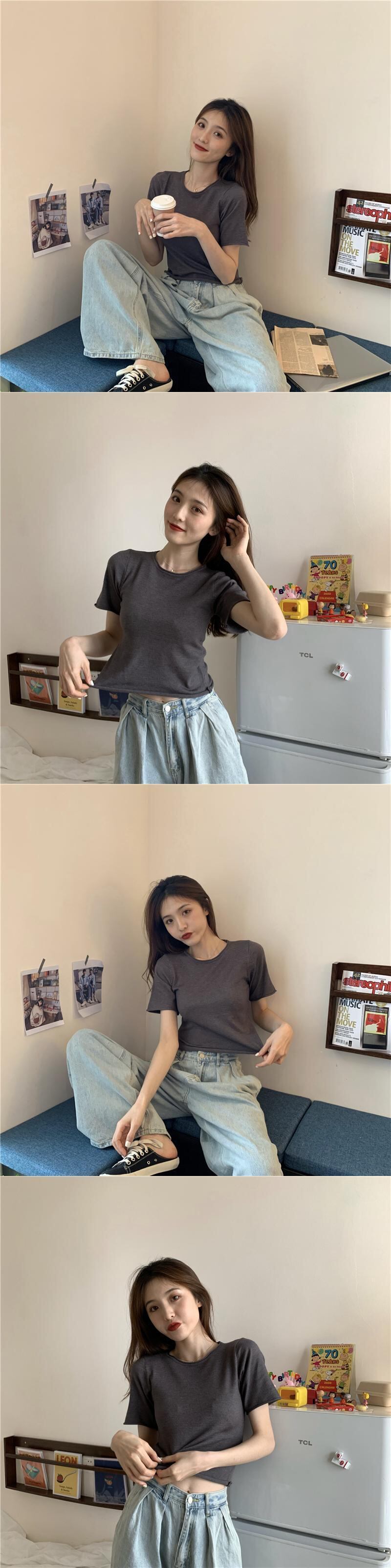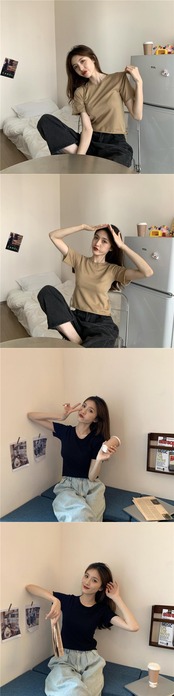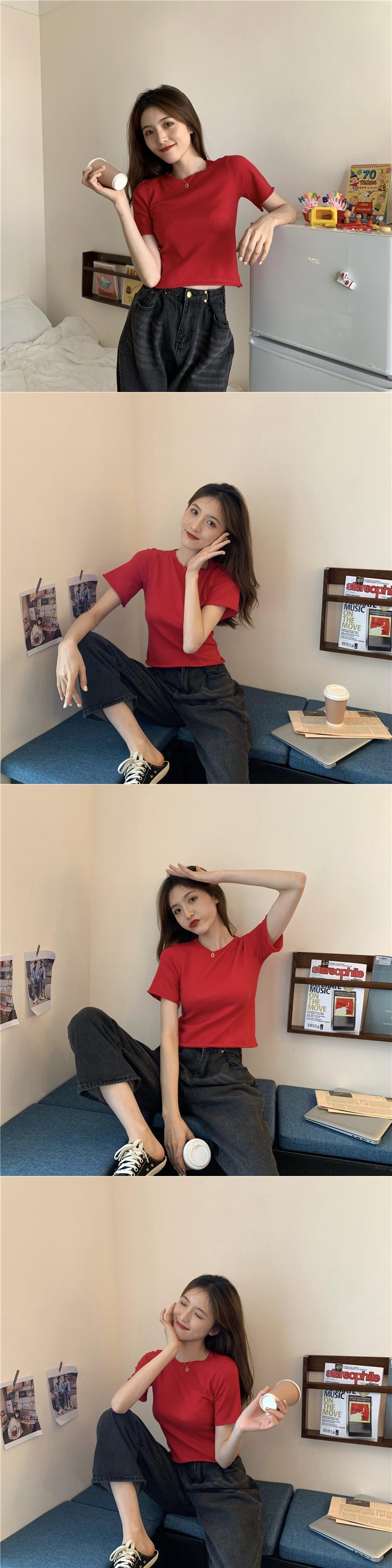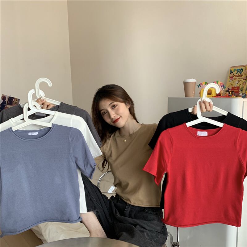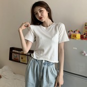 ホワイトショートTシャツレディース夏服フィットソリッド カラーニットハイウェストトップス 夏物 ソリッドカラー ウエスト Marchs60365832991