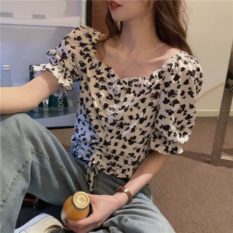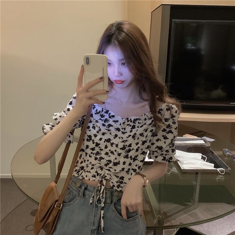夏服スタンダードハイウェストウェストフローラルシャツ スリーブショートギャザートップス レトロ 夏物 花柄 ウエスト Marchs74900984602