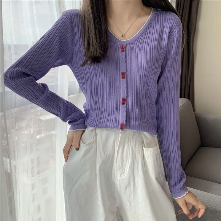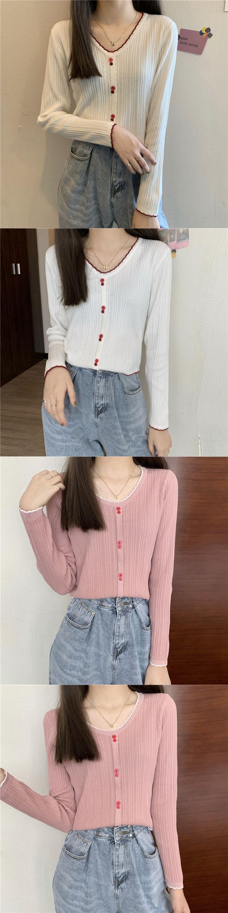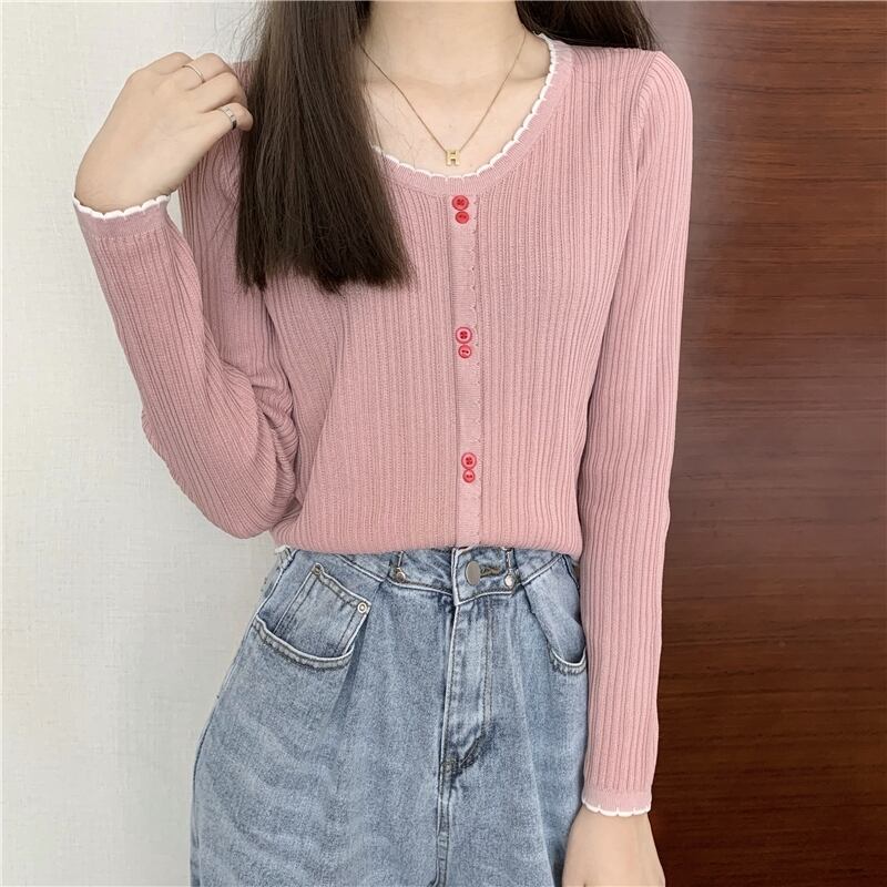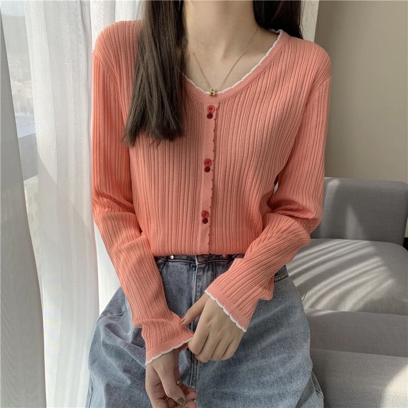 ニット スプリングカラーVネックTシャツシャツ レースゆったりスタイルストライプトップス ロング 春物 長袖 Marchs33171145390