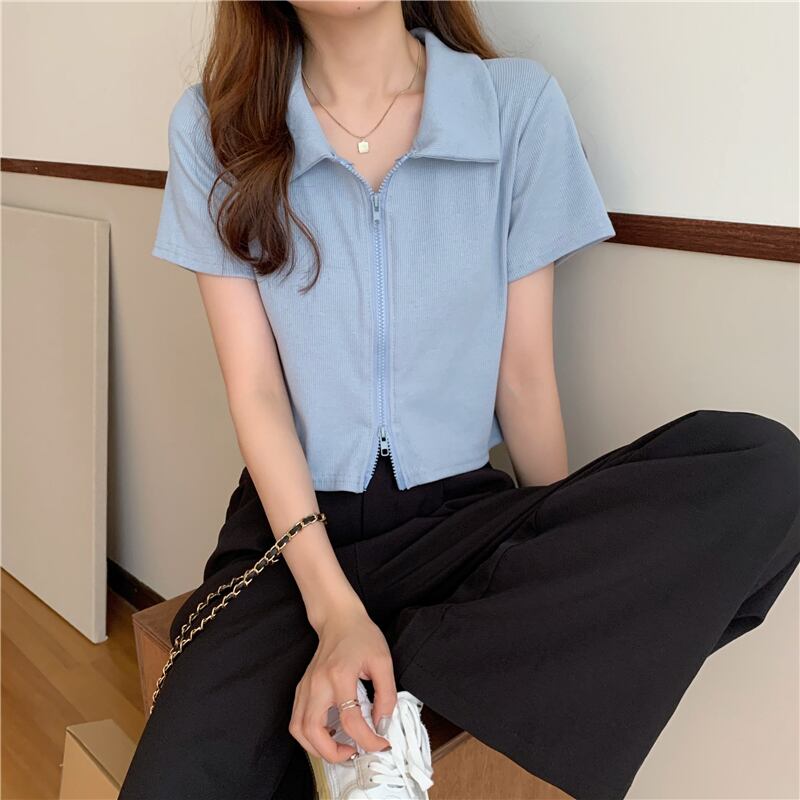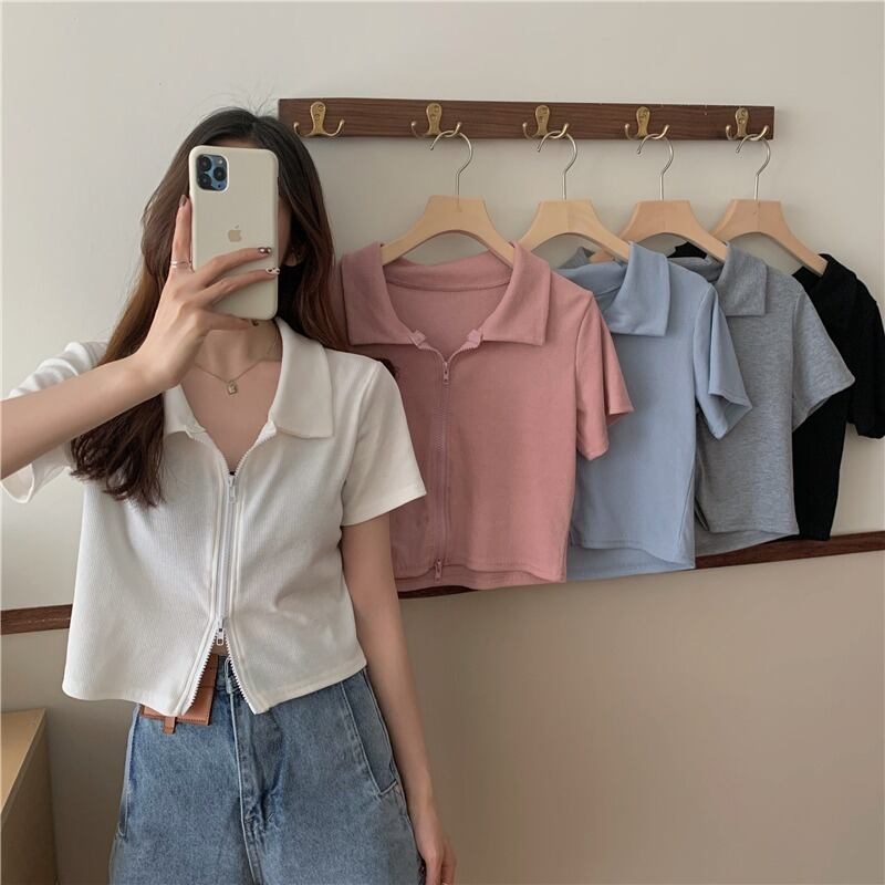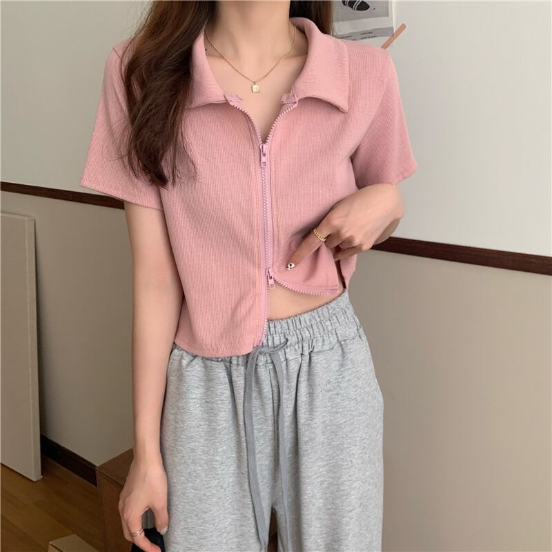 シャツ ショートTシャツレディース夏服スリムハイウェストウェストダブルジッパートップス トレンド ピンク 夏物 ウエスト Marchs5489245792