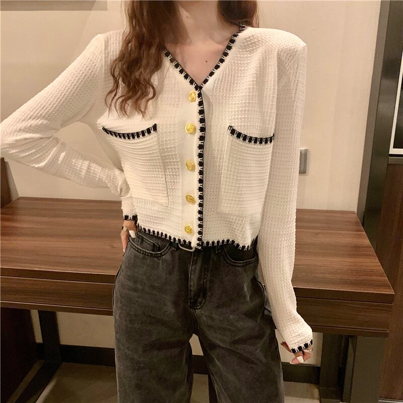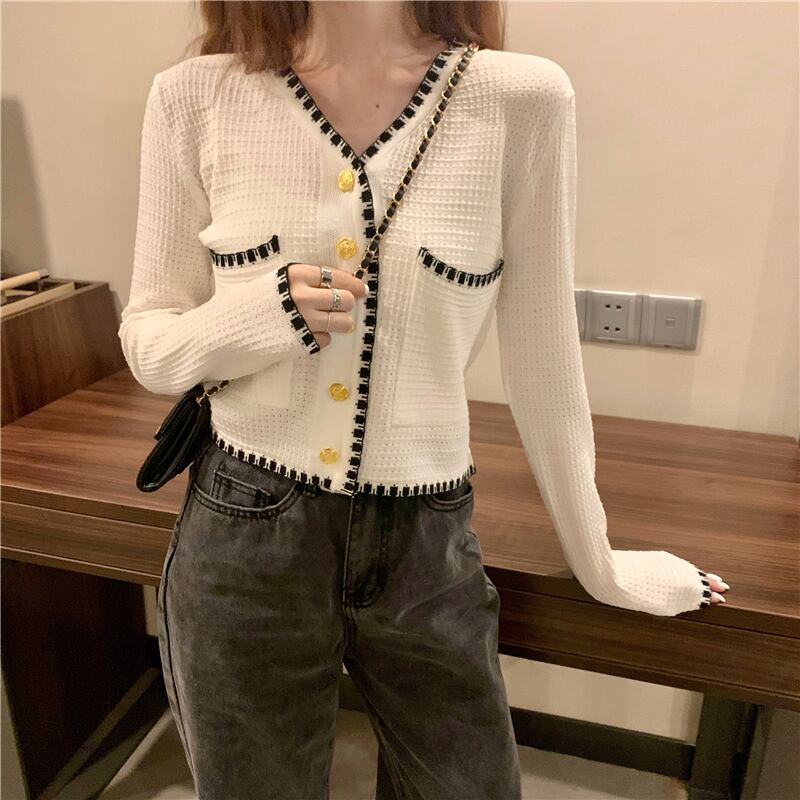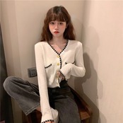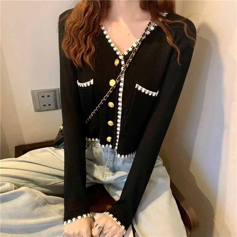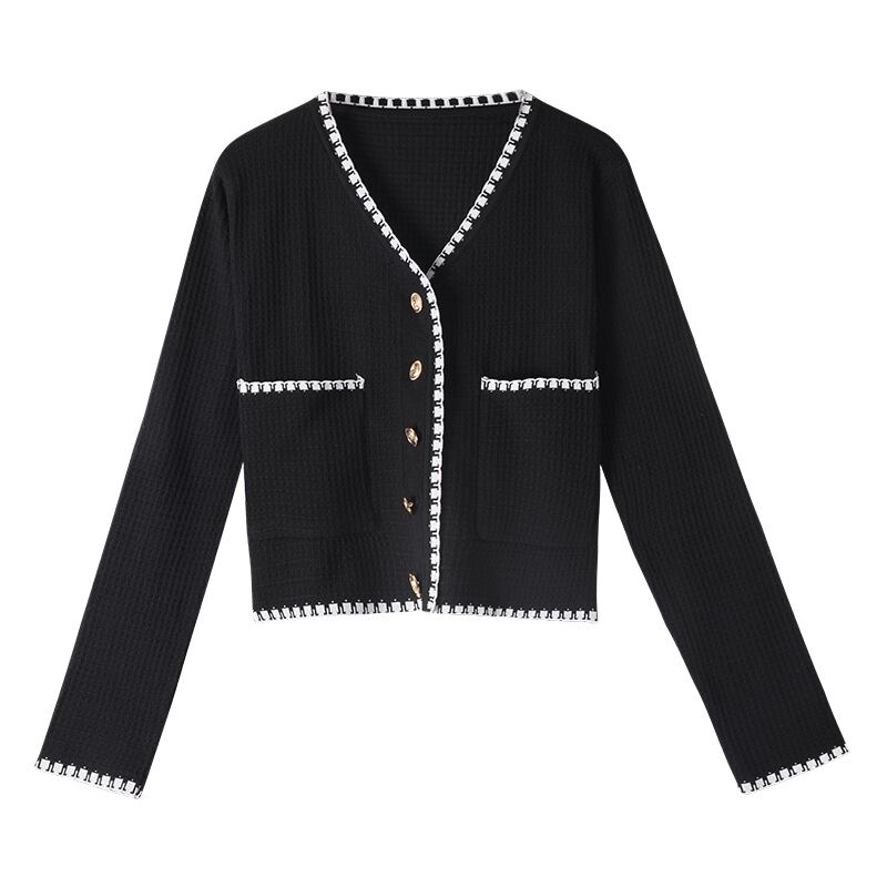 Vネックショートカーディガンジャケット ブラックニットセーター スプリングスリムルーズ 春物 Marchs94888567658