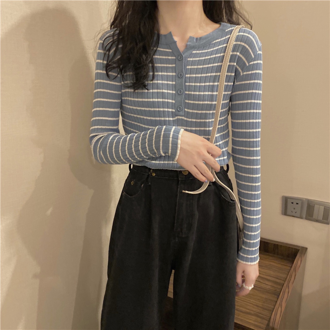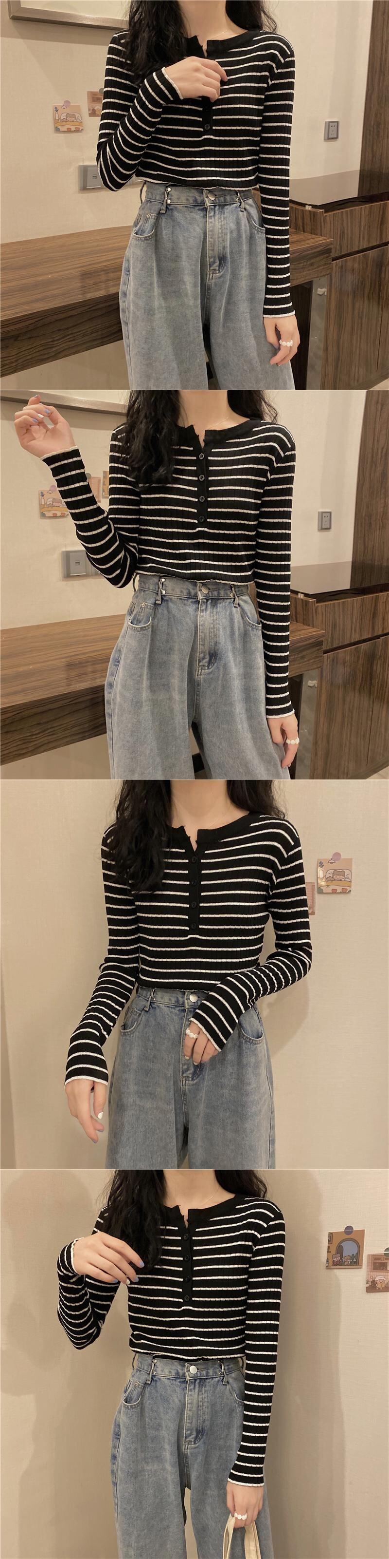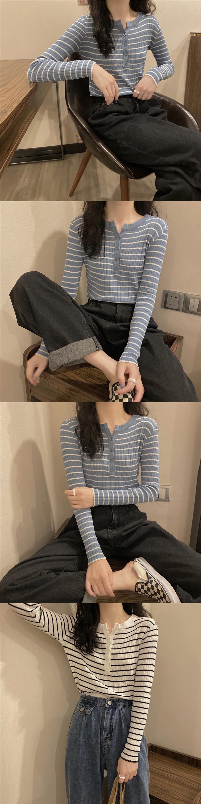 ストライプゆったりシャツ スプリング秋物ニットセーター スリムトップス Tシャツ ロング 春物 オータム 長袖 Marchs1528715899
