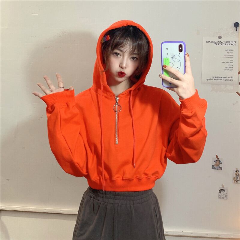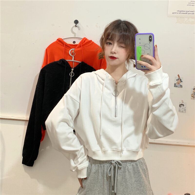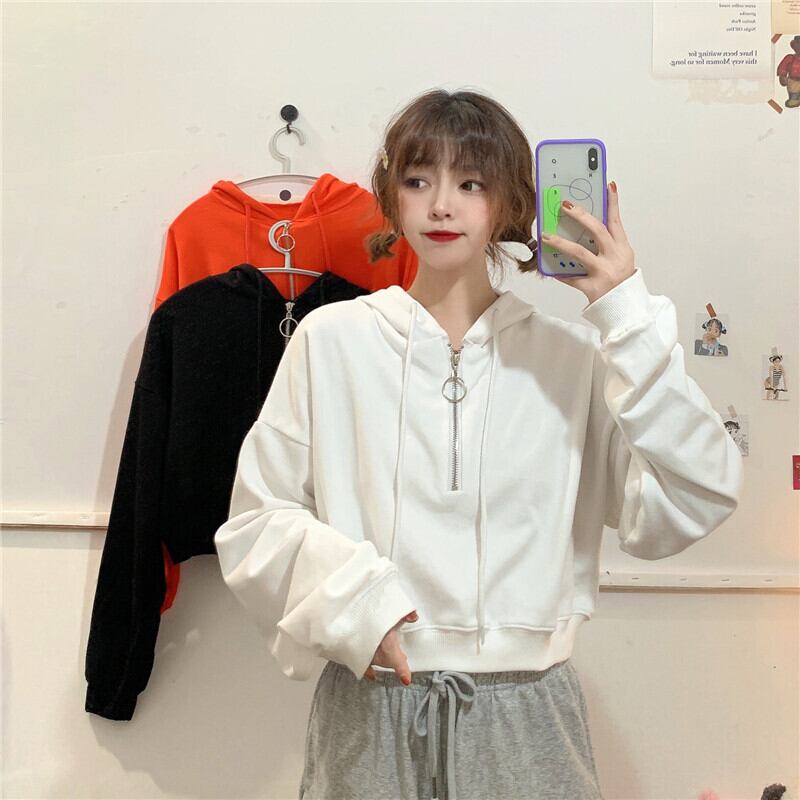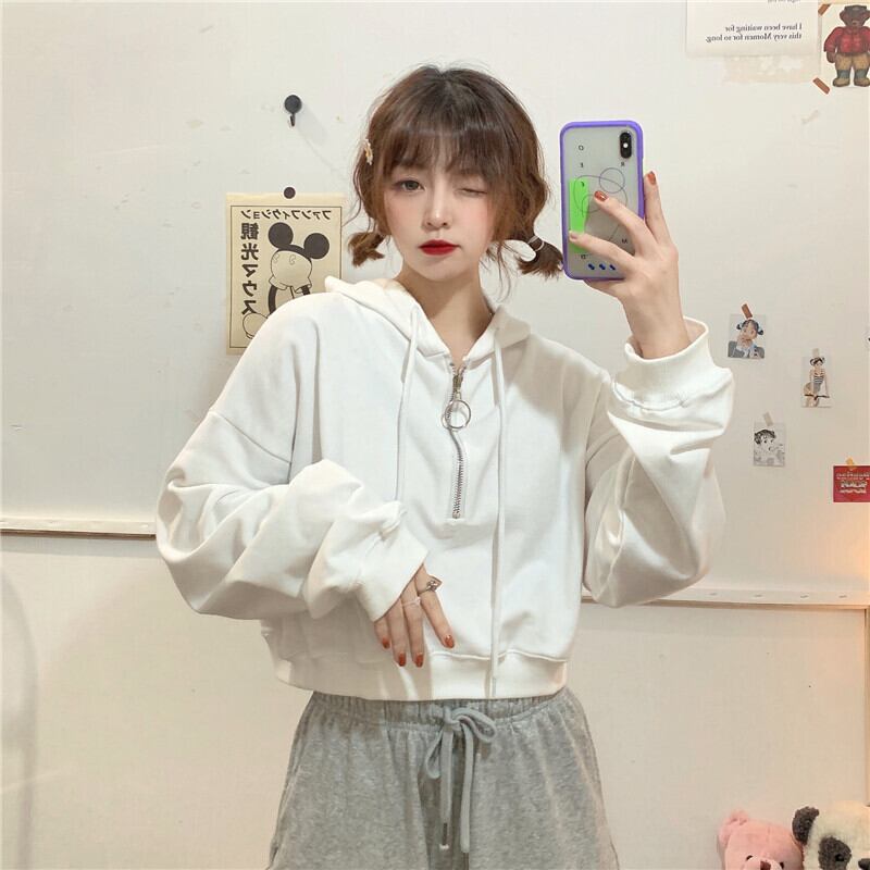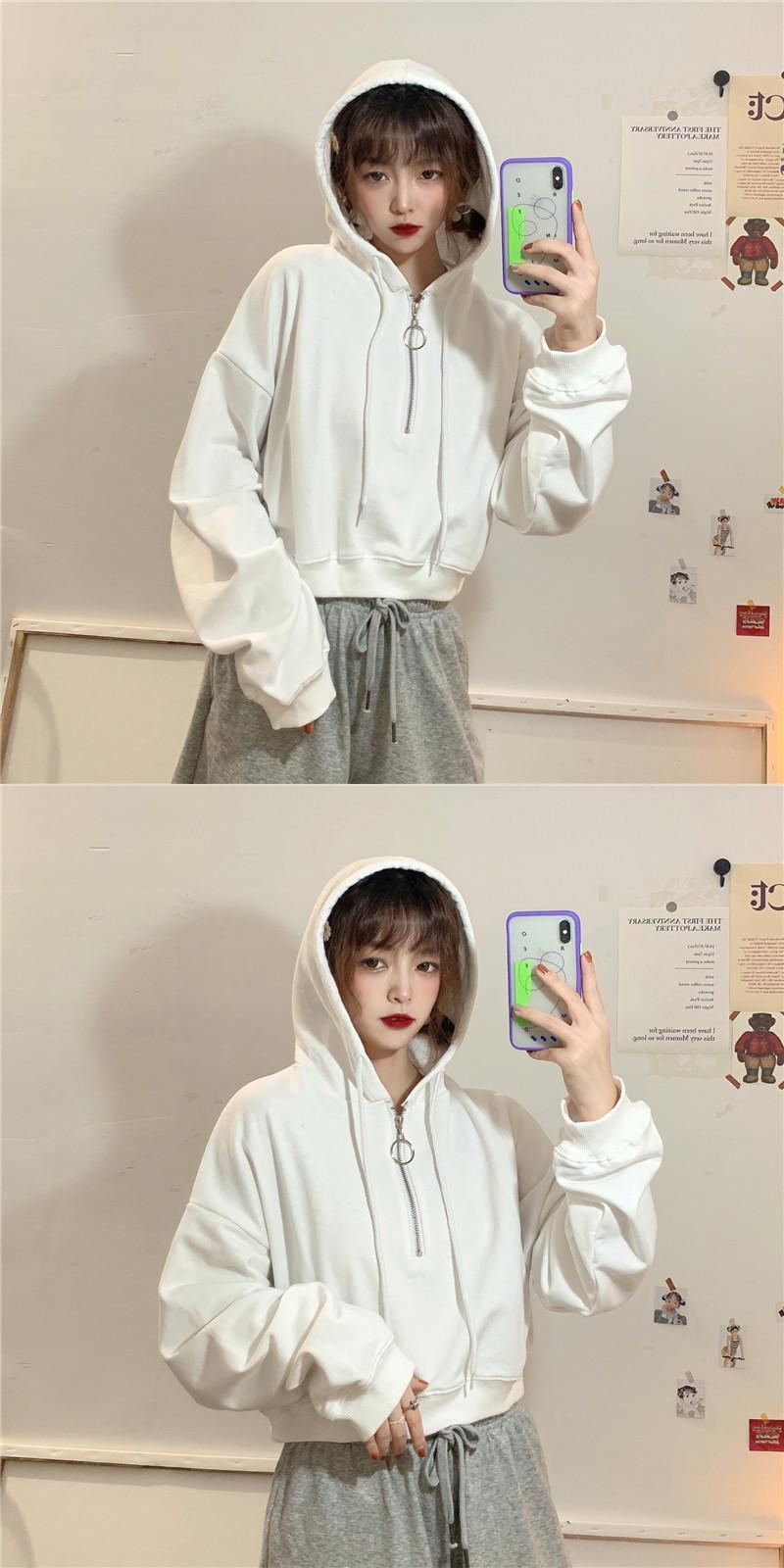 ジッパーフードホワイトショートセーター レディース韓国ファッションスタイルルーズハイウェストウェストクロップトップ トップス スプリング秋物 春物 オータム ウエスト Marchs31456096501