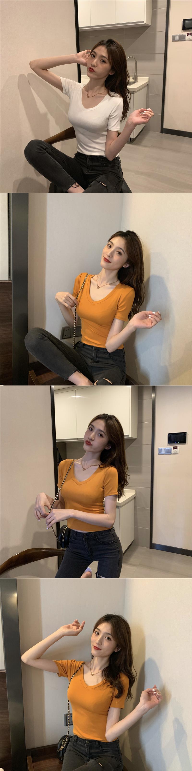 半袖スリーブTシャツスリム夏服ウェストVネックブルートップス ショート ハーフスリーブ 夏物 ウエスト Marchs70433219675