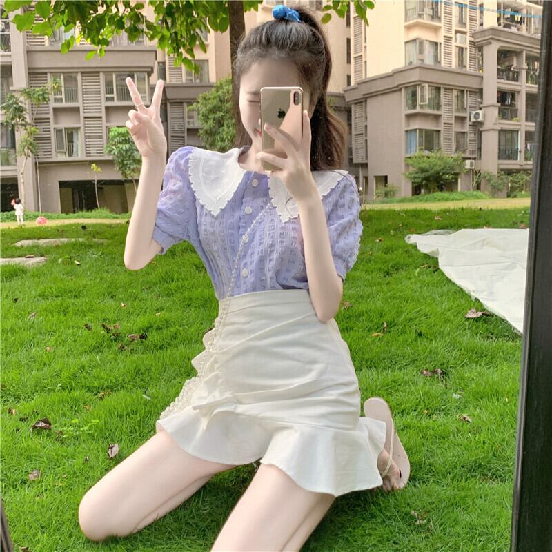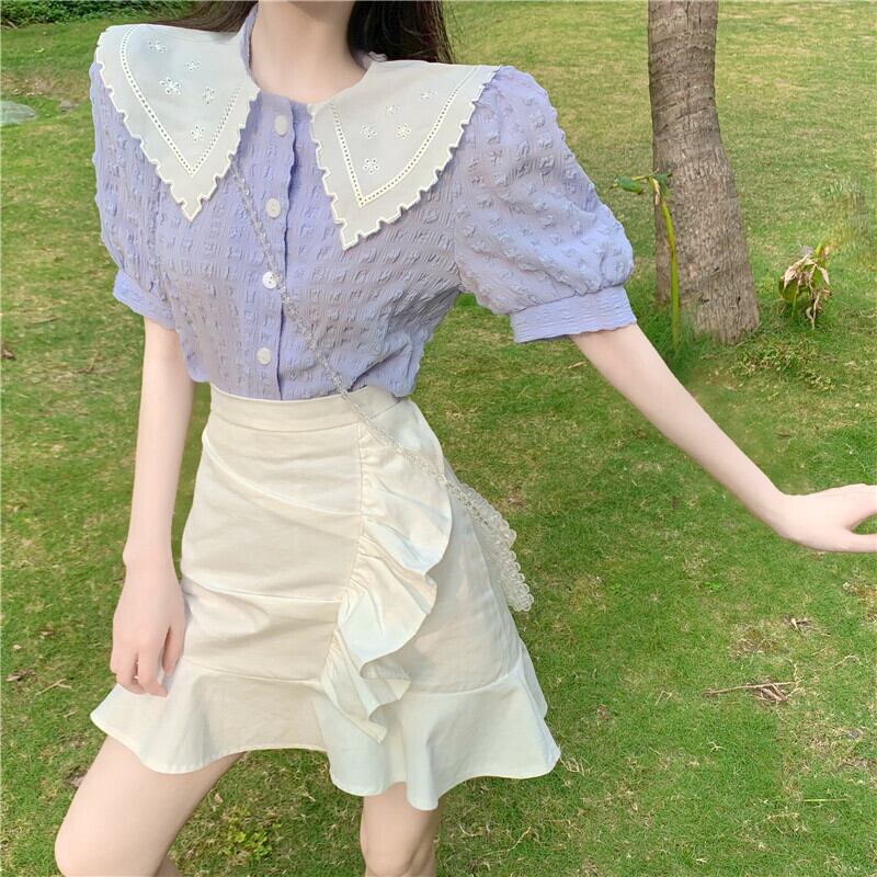 夏服スタンダードスリーブフローラルブラウス カラーシャツ レトロ 夏物 花柄 パープル Marchs63111889120