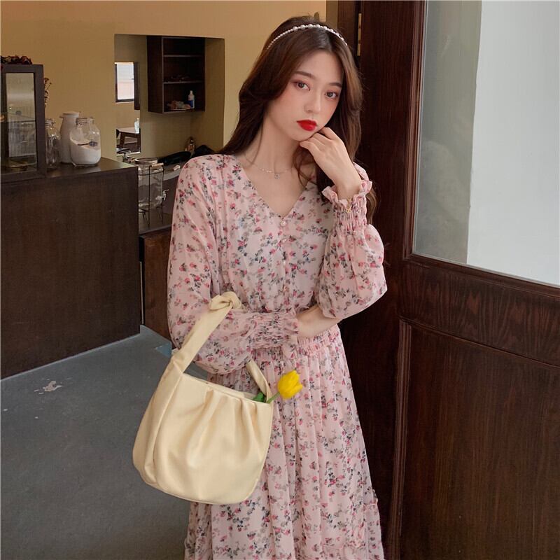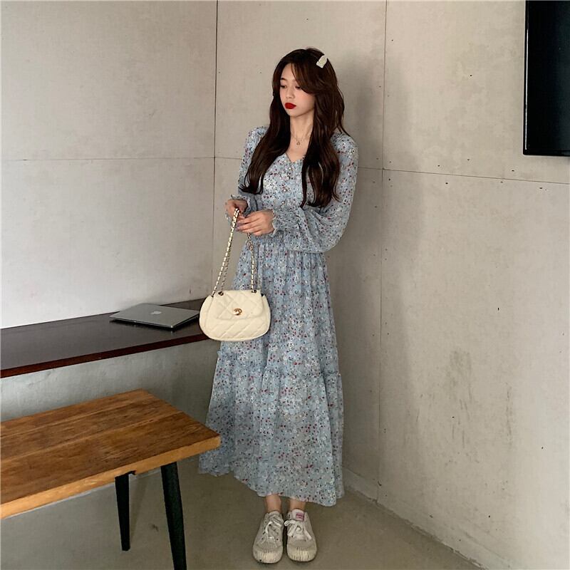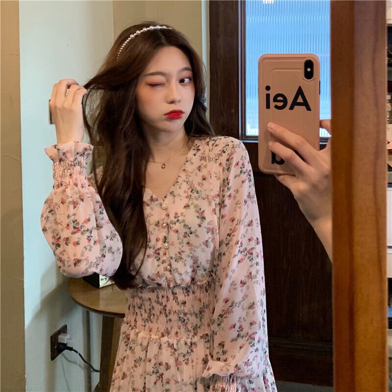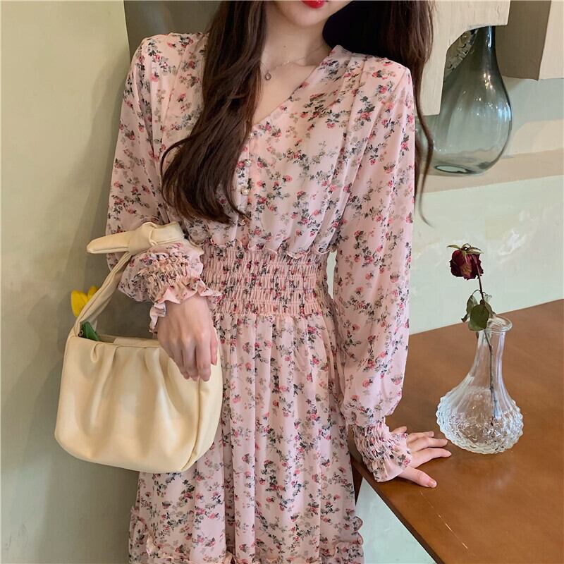 夏服シフォンフローラルロングワンピースレディースウェスト薄手 夏物 花柄 長袖 ウエスト Marchs69708857614