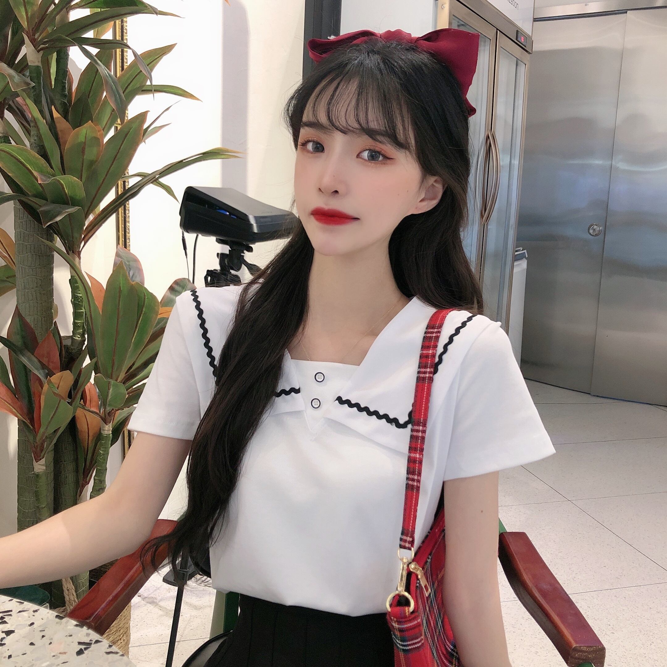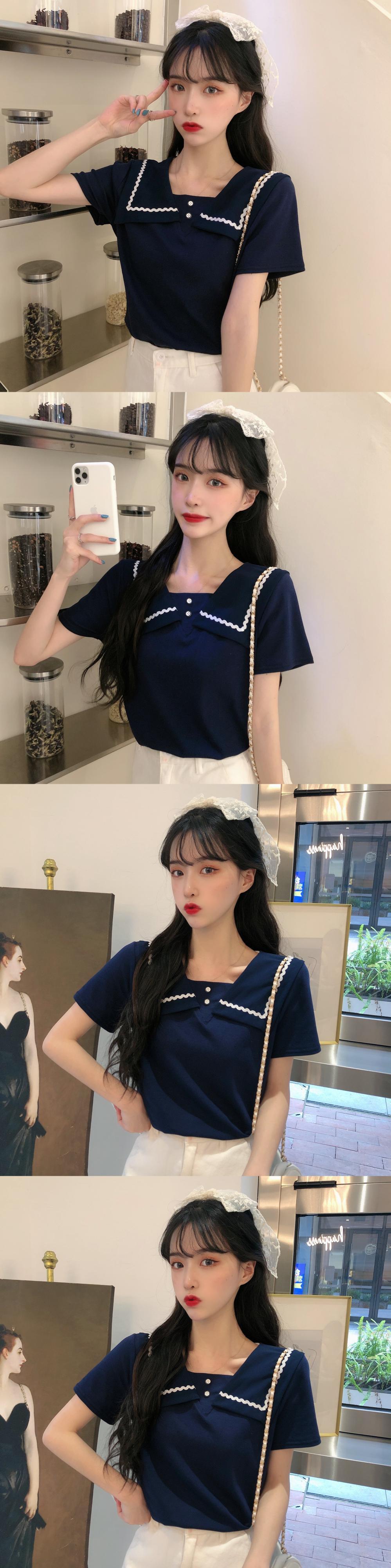 ネイビーカラーホワイトショートTシャツレディーストレンド夏服ハイウェストウェストトップス 夏物 ウエスト Marchs18746251543