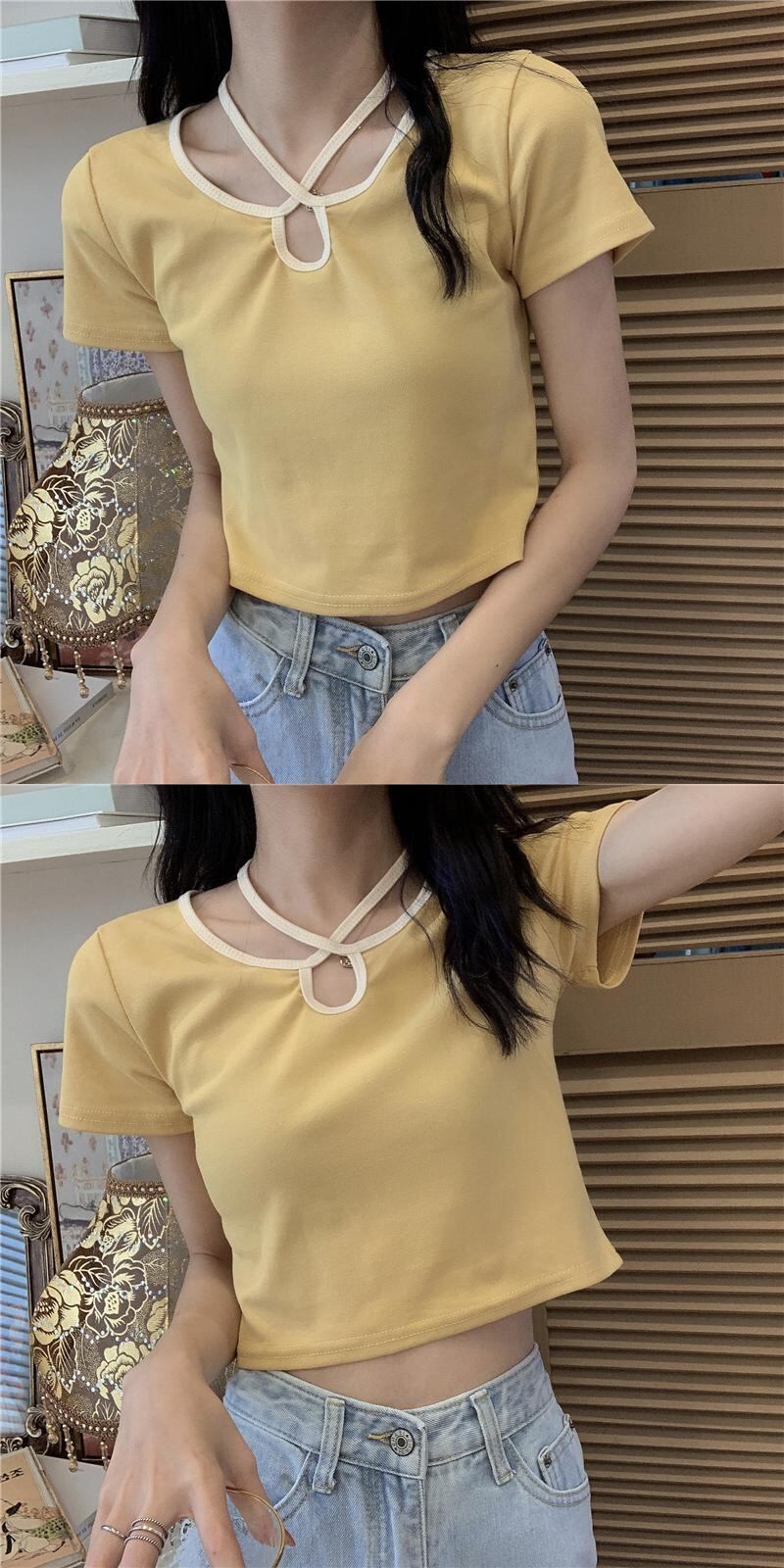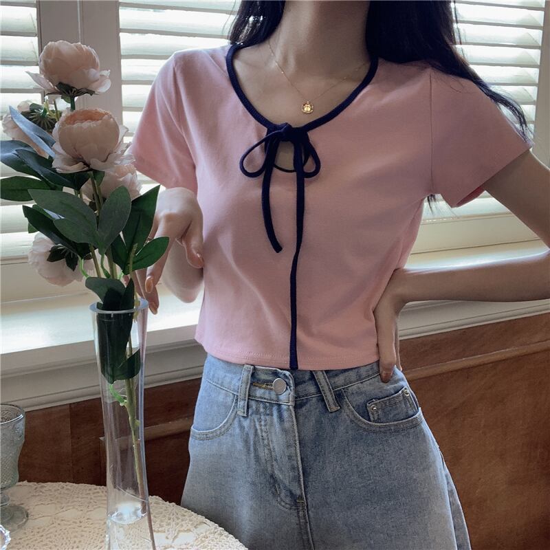 夏服カラーショートブラックTシャツゆったりトップス レース 夏物 レースアップ Marchs27725133442