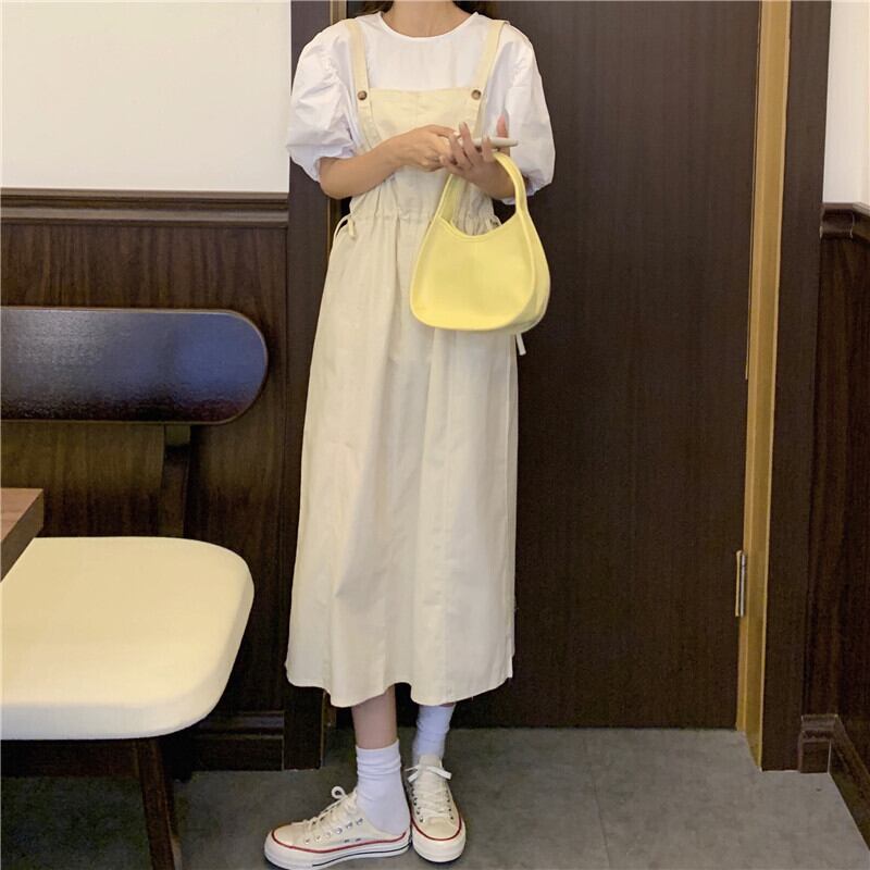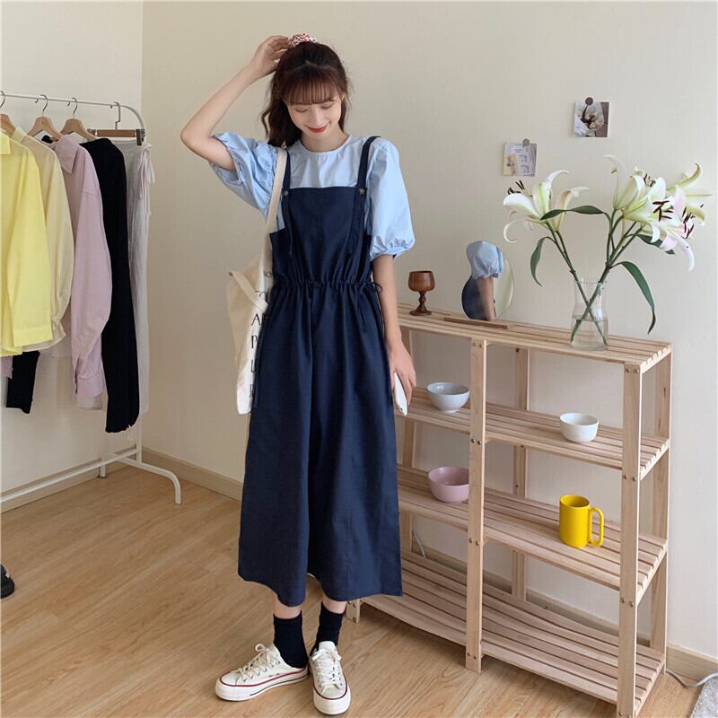 色:ホワイトトップ,ブルートップ,ネイビーブルーのサスペンダースカート,アプリコットストラップドレス