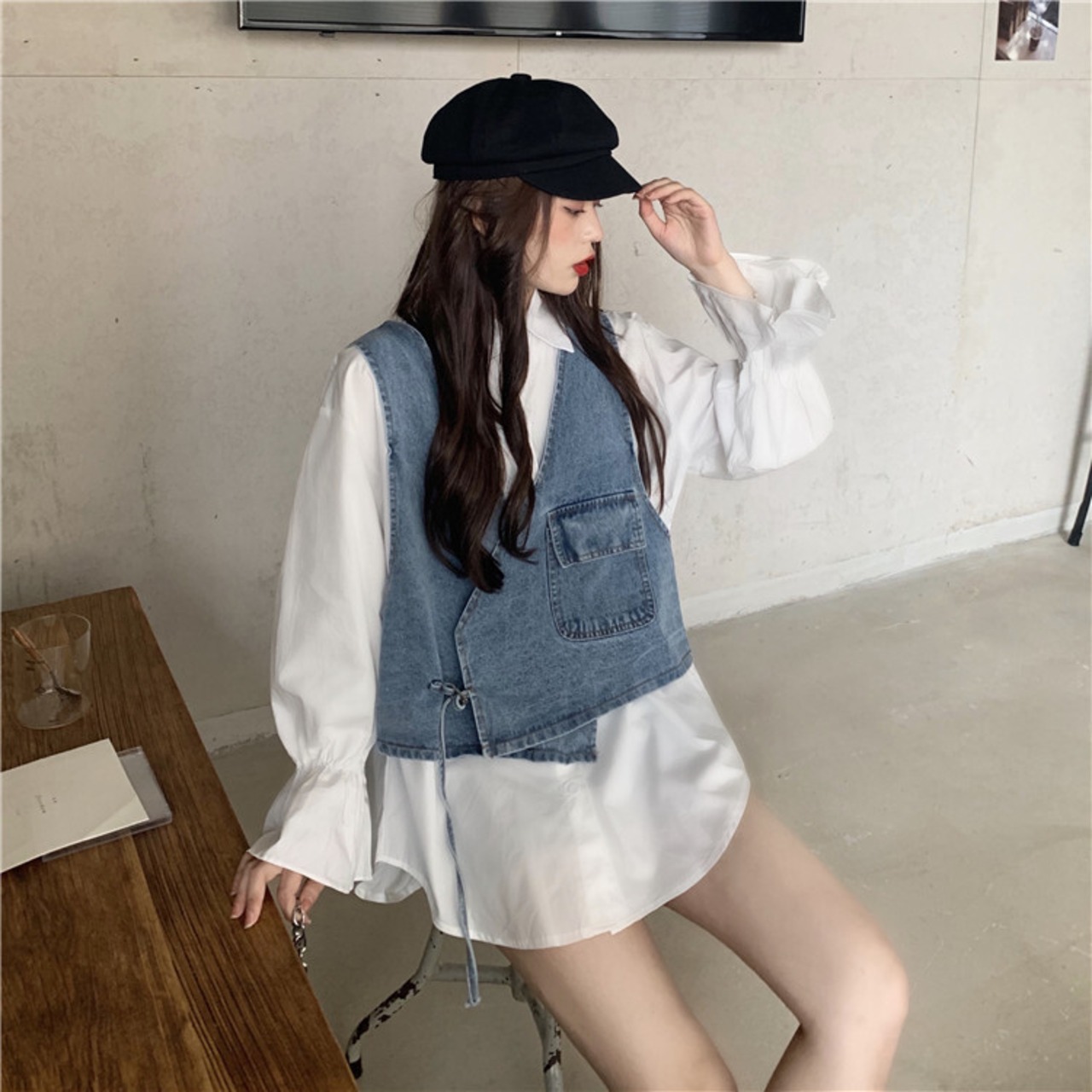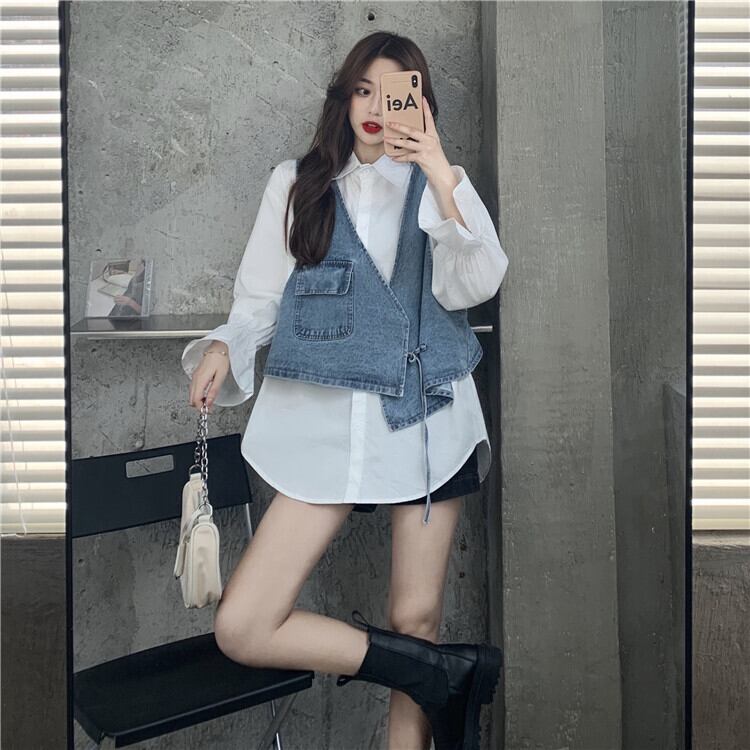 Vネックスプリング秋物ルーズ韓国ファッションスタイルノースリーブブラウス ショート レース 春物 オータム レースアップ ウエスト Marchs28505263900