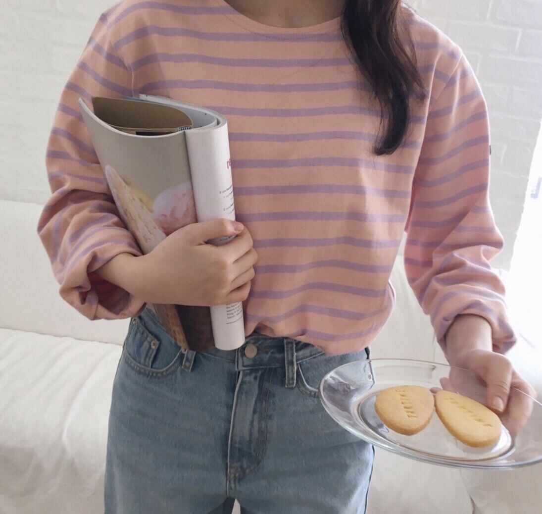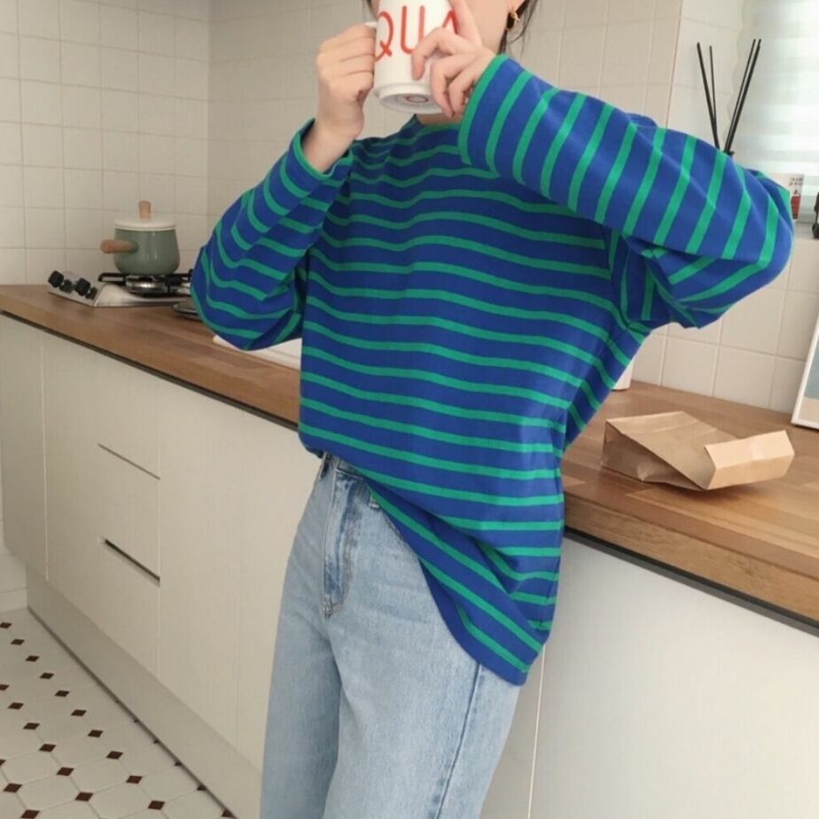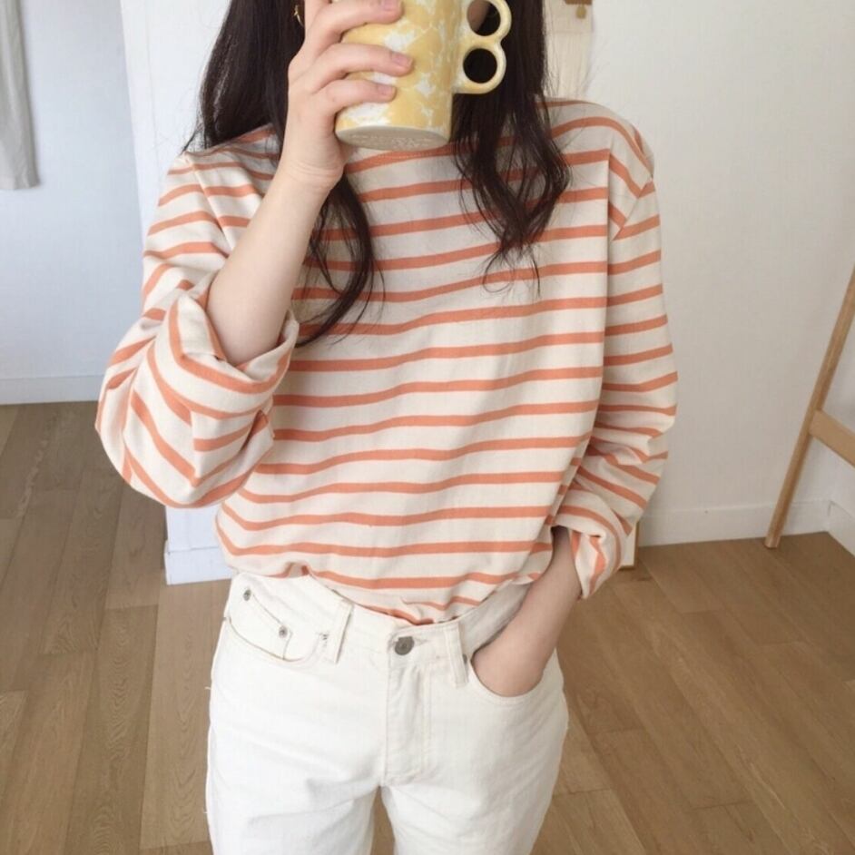 スプリング秋物韓国ファッションストライプTシャツシャツ レディースルーズカジュアルスタイルゆったりトップス トレンド ロング 春物 オータム 長袖 Marchs37860132240