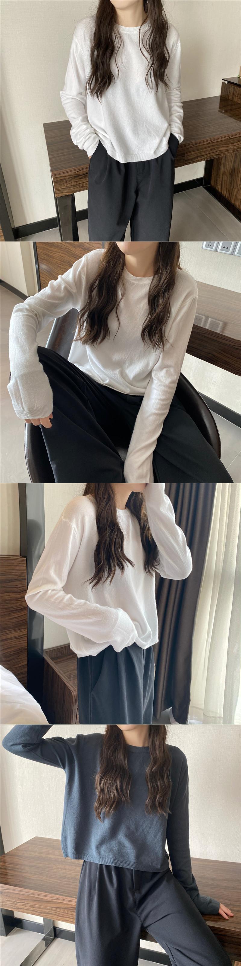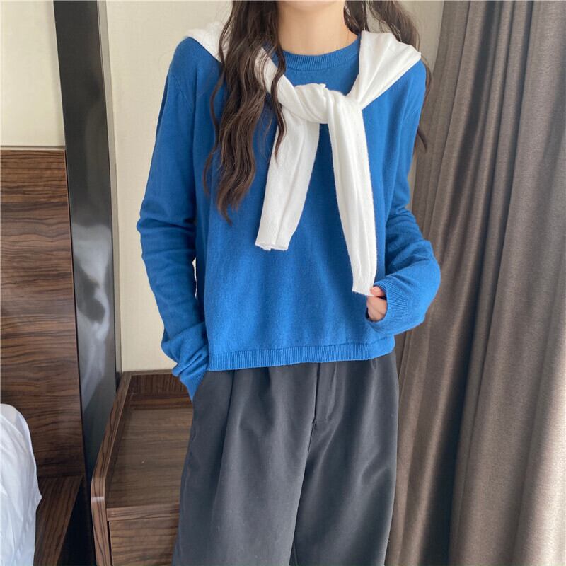 スプリング韓国ファッションラウンドネックプルオーバー ニットトップス ショートルーズ薄手シャツ ロング 春物 Oネック 長袖 Marchs84862466087