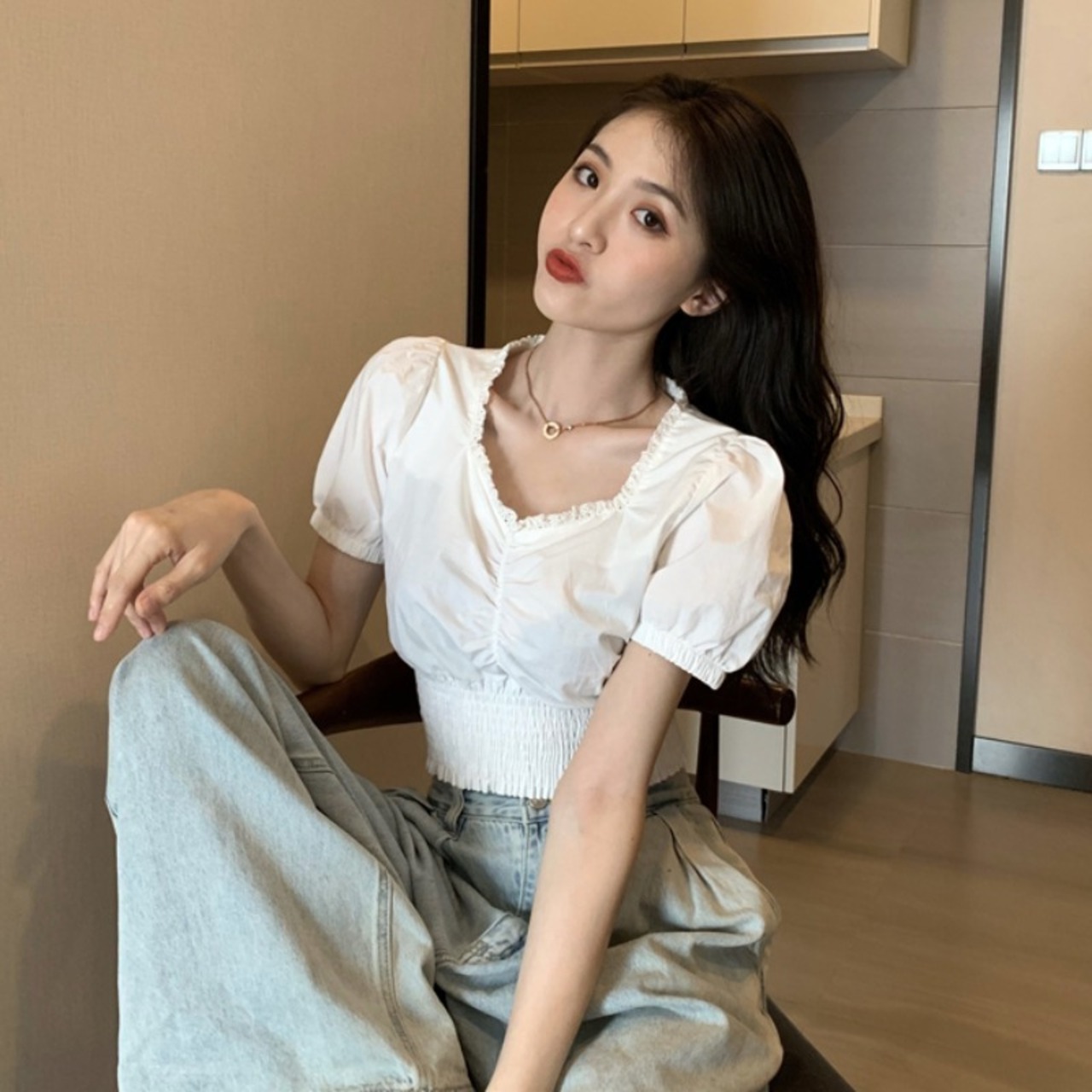 ショートウェストシャツ 夏服スタイルVネックトップス 夏物 ウエスト Marchs76787825521