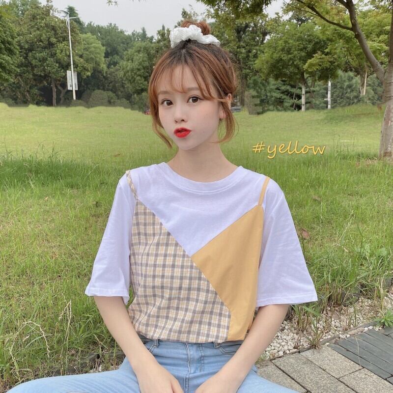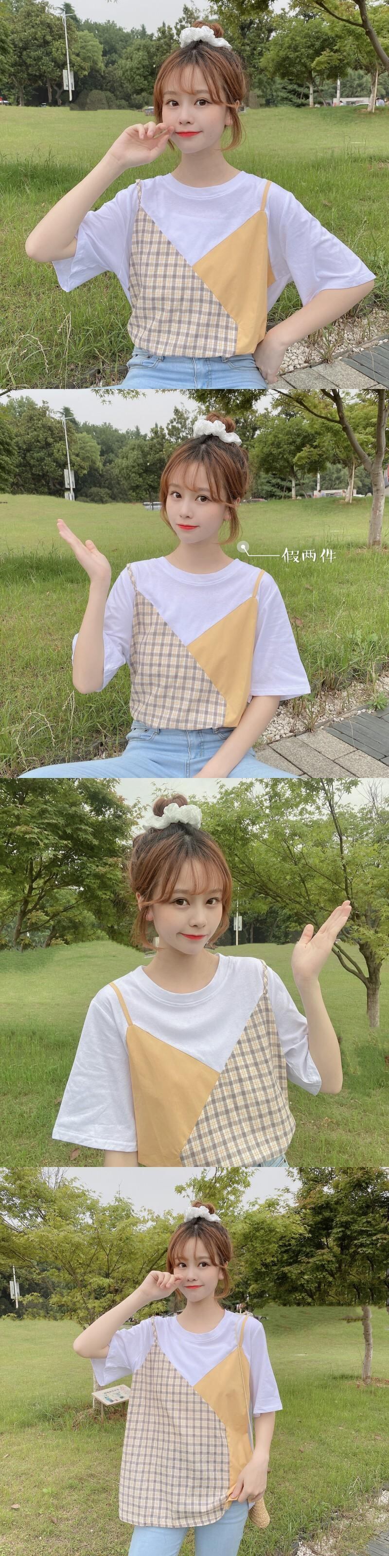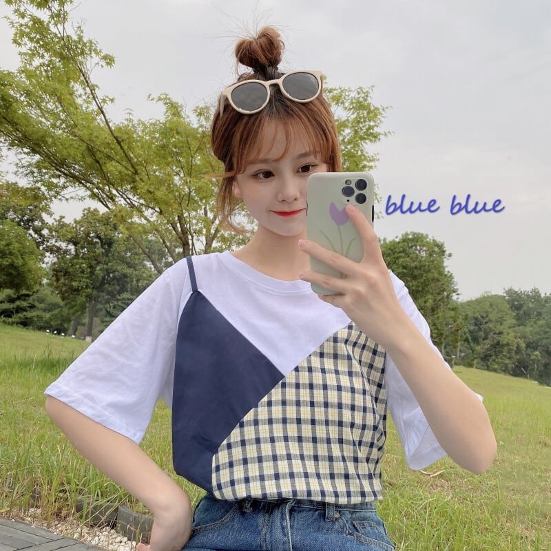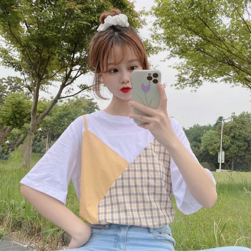夏服Tシャツレディーストレンド格子柄ゆったりトップス 夏物 ステッチ Marchs75367259848