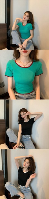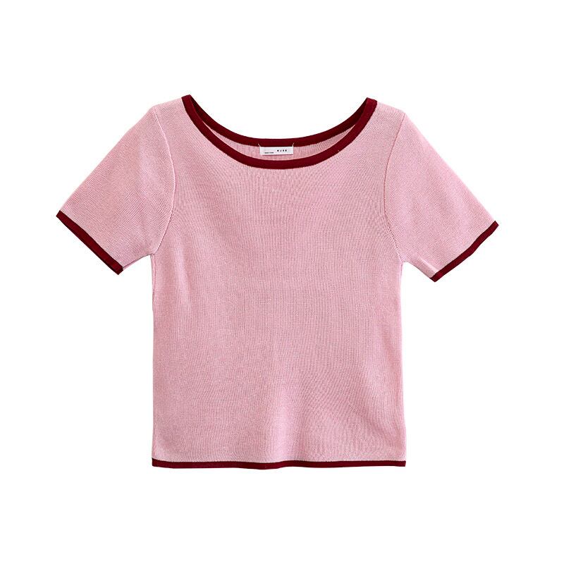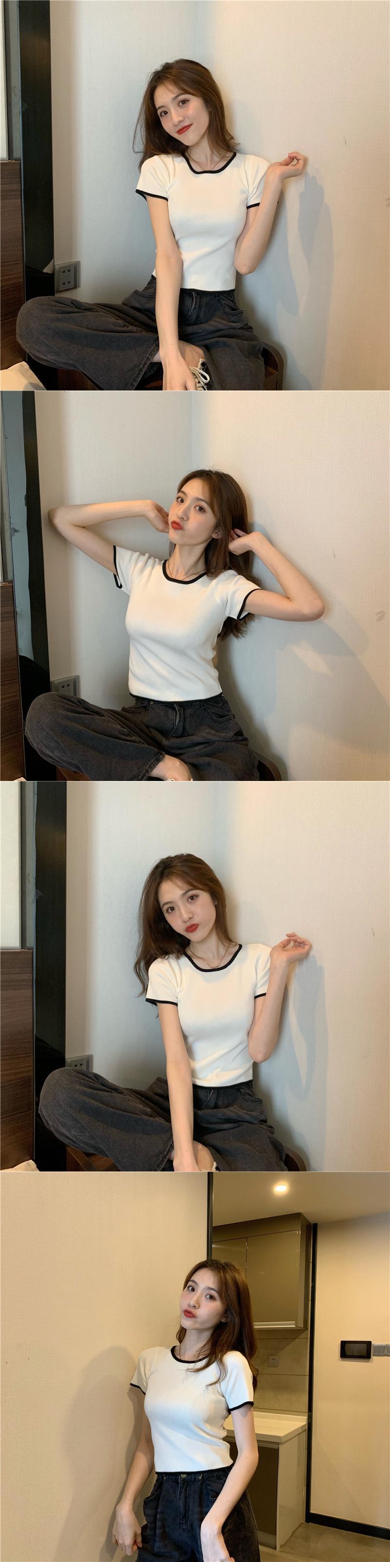 ブラックニットショートTシャツ夏服スリムフィットトップス ハイウェストパンツ 夏物 シルク ウエスト Marchs649522980