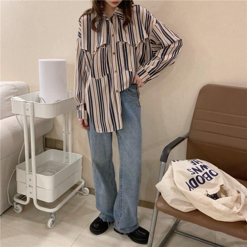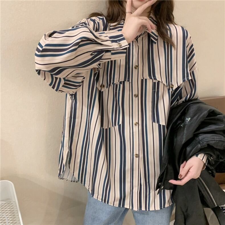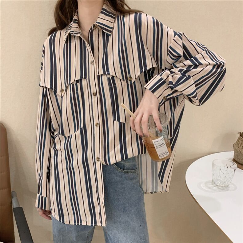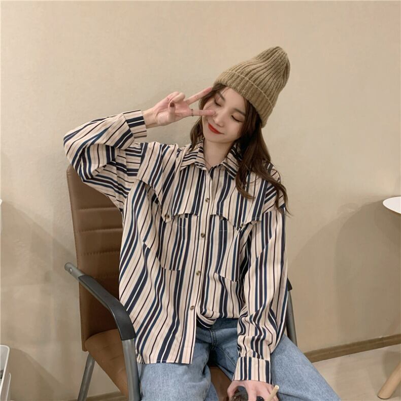 スタンダードスタイルストライプシャツ レディーススプリングルーズ レトロ 春物 Marchs98274741908