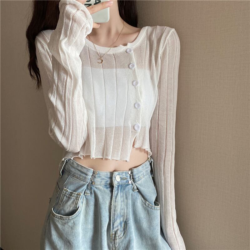 夏服ニットトップス 韓国ファッションルーズ薄手ブラウス ショートゆったりシャツ ロング 夏物 スタイル 長袖 Marchs87226644116