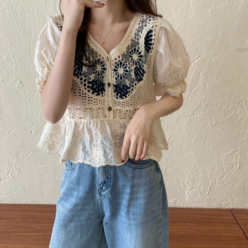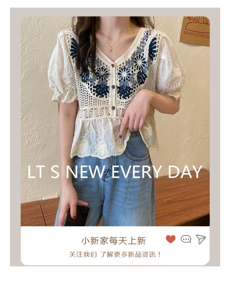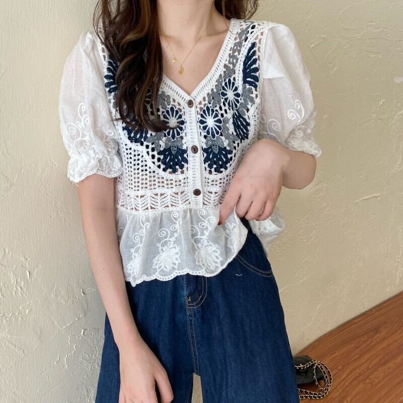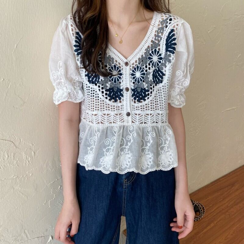 Vネックショートシャツ 夏服韓国ファッション薄手刺繍トップス 夏物 Marchs260260439