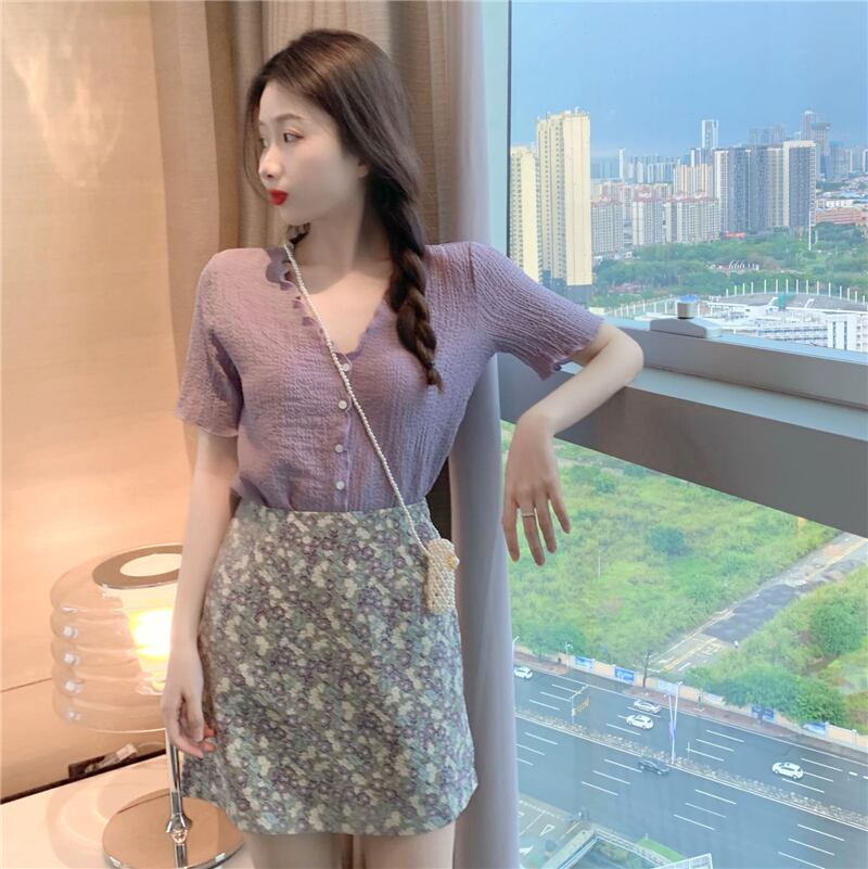 Vネックショートシフォンシャツ レディースフローラルハイウェストウェスト薄手Aラインスカート 花柄 ウエスト Marchs10060762715