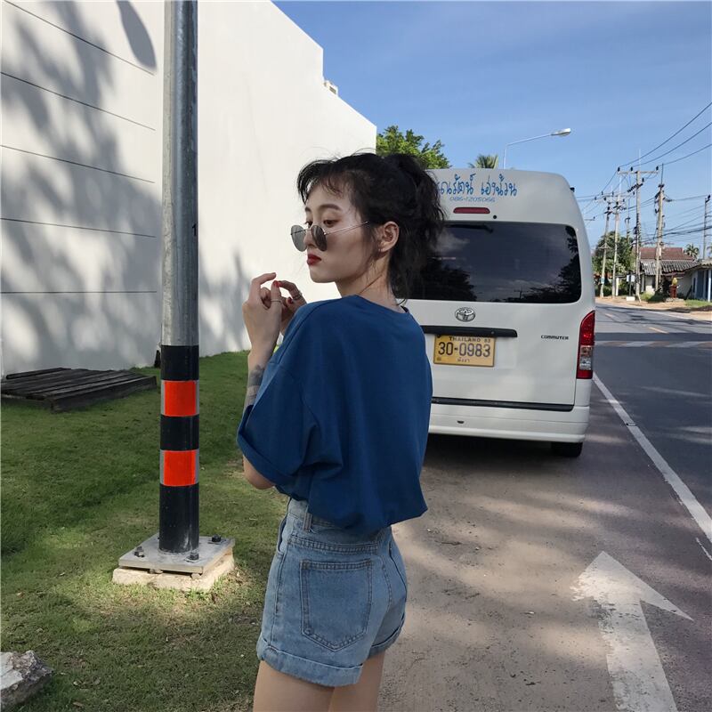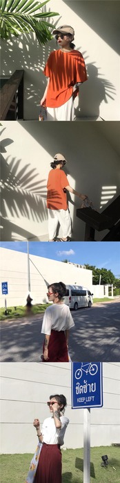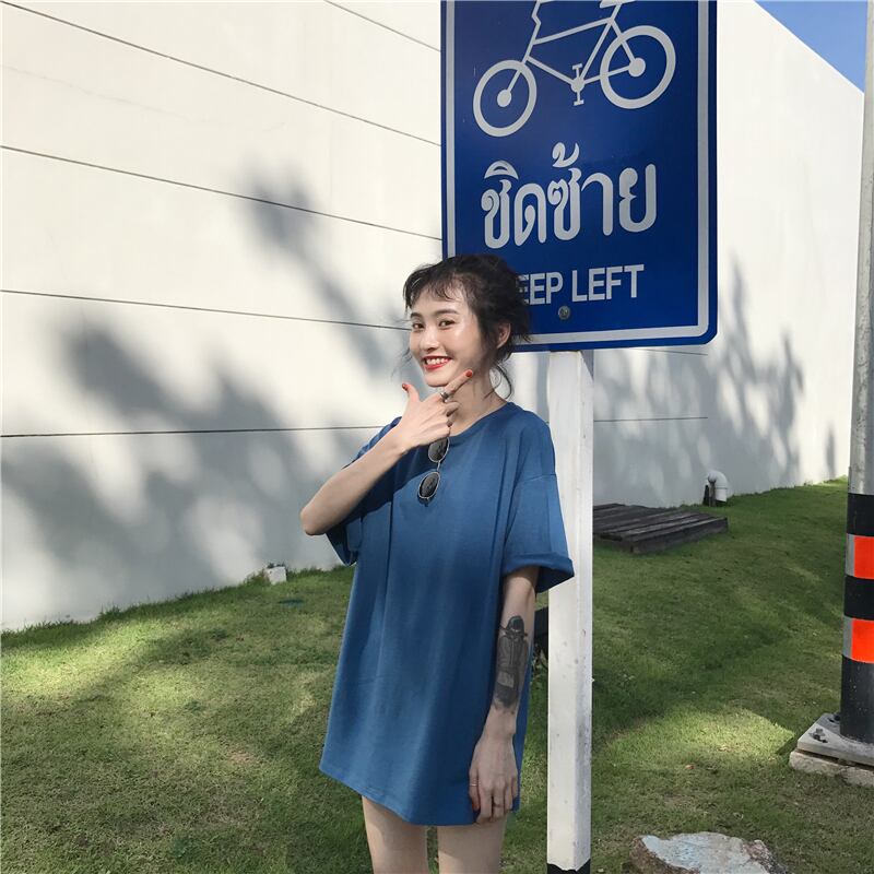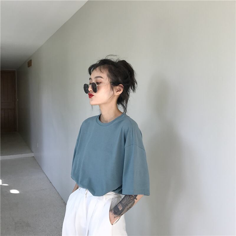 ルーズ薄手ソリッド カラープルオーバー ラウンドネックTシャツスプリングベーシックカジュアルゆったりトップス 春物 Oネック ソリッドカラー Marchs21317655110