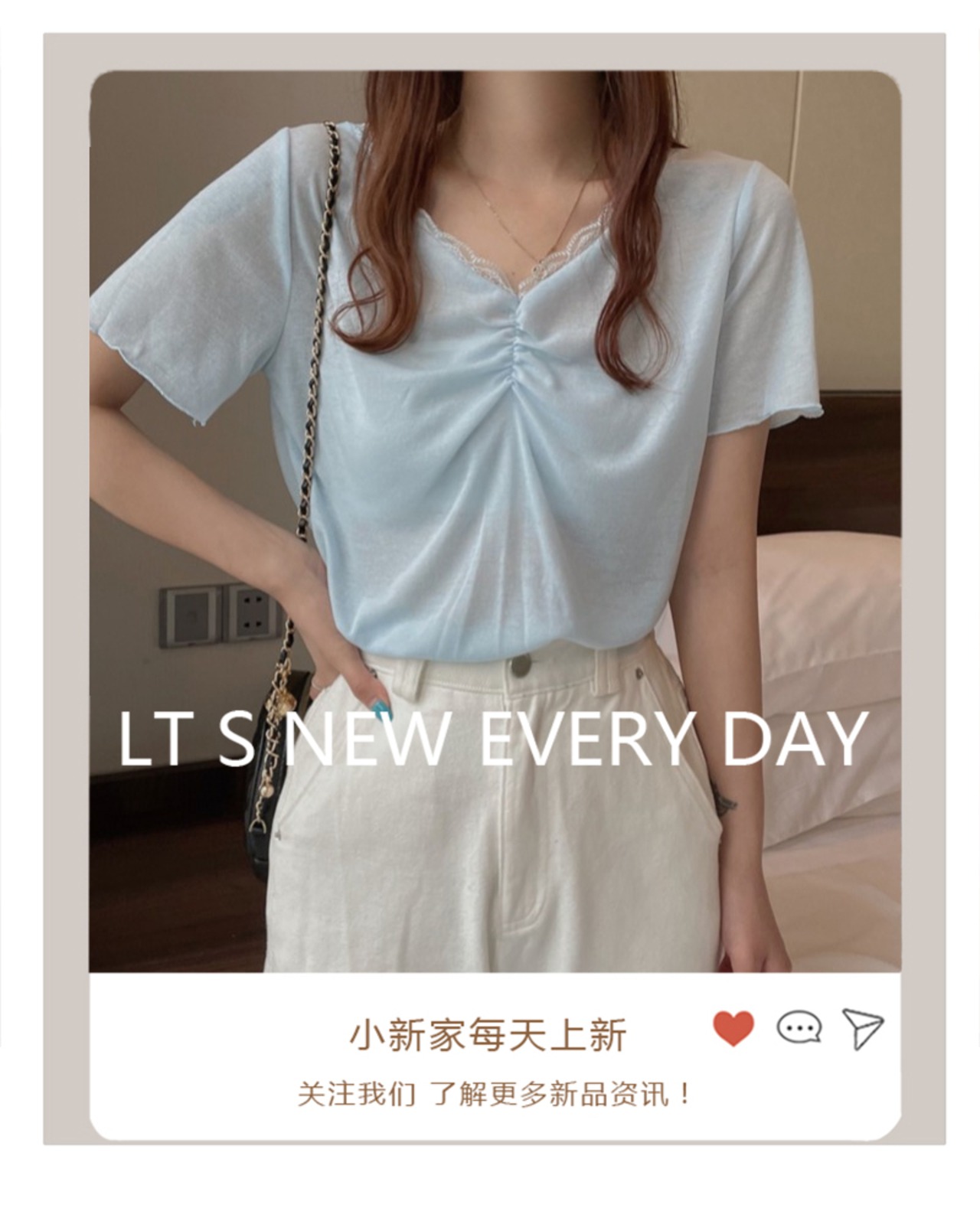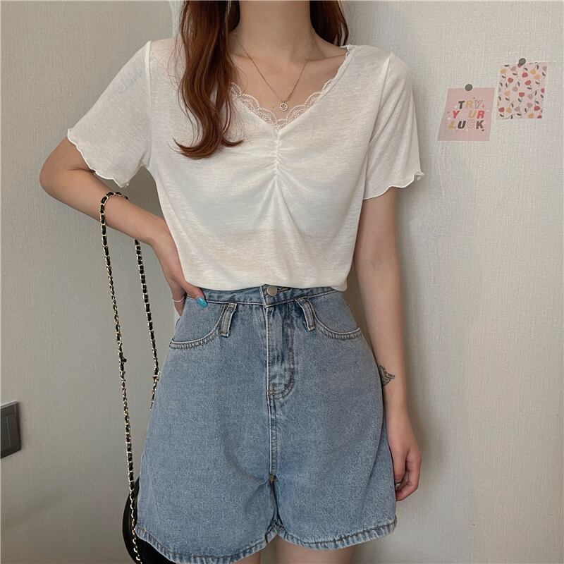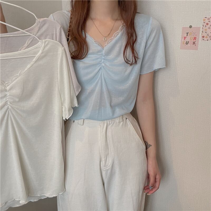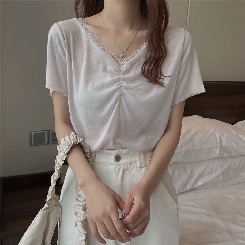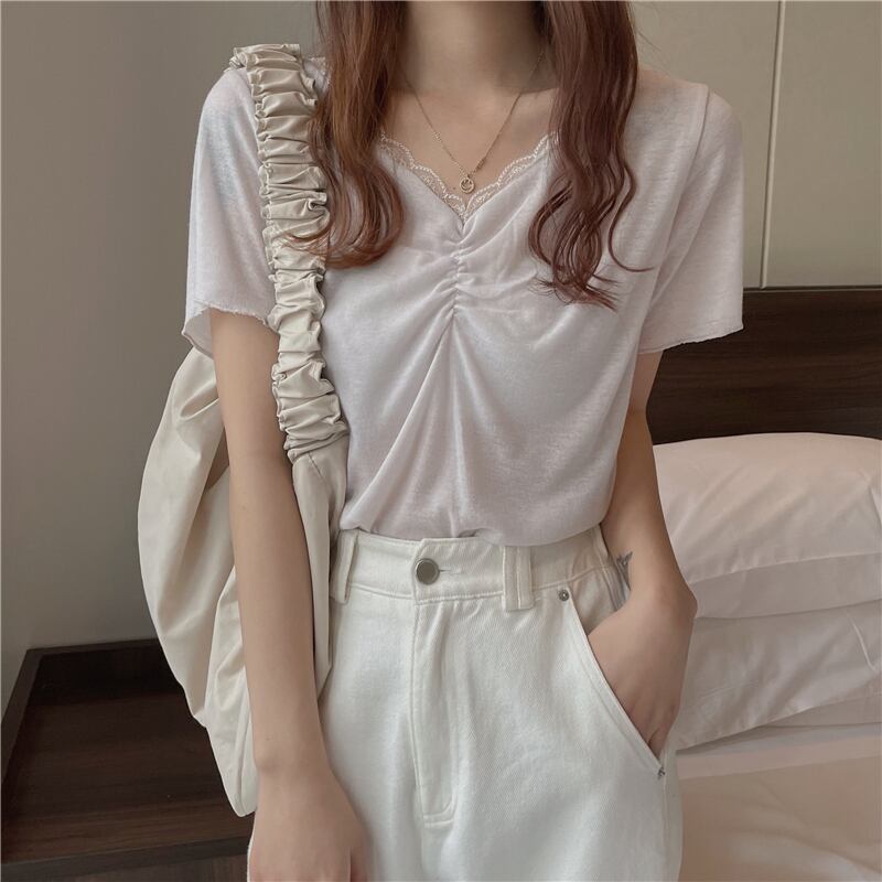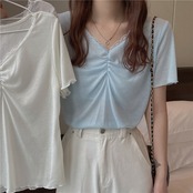 薄手ホワイトTシャツシャツ 夏服Vネックルーズゆったりトップス 夏物 ステッチ Marchs84576112677