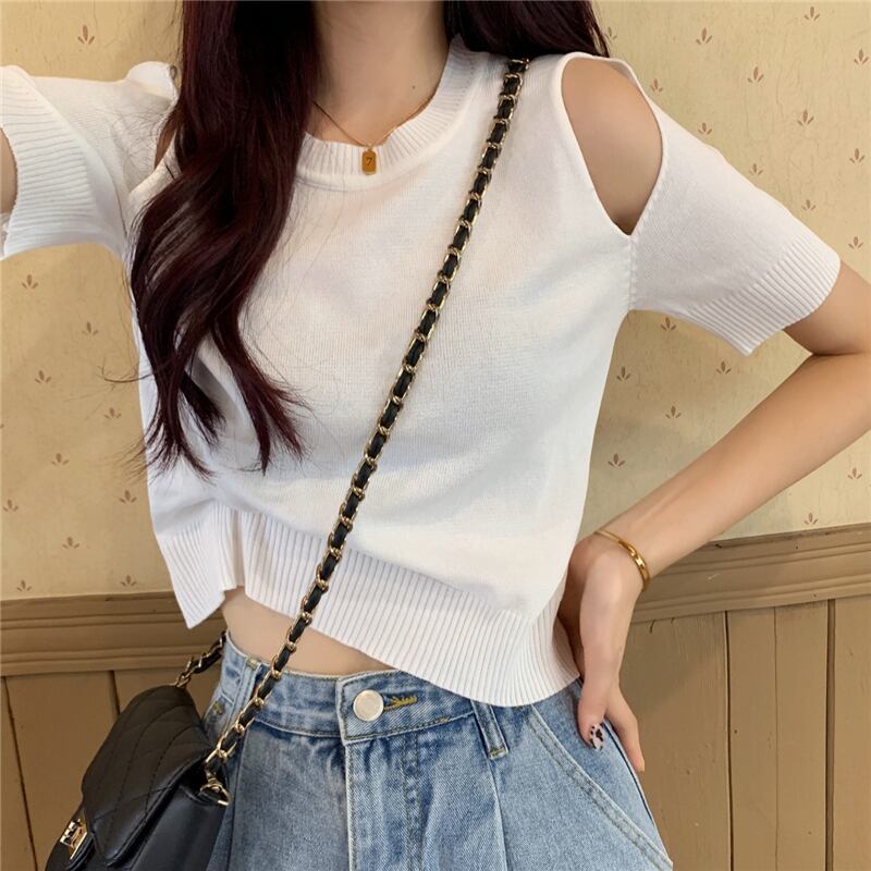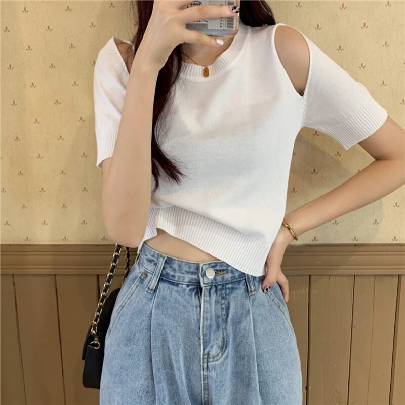 クロップドトップス 夏服ハイウェストウェストパンツ ルーズ薄手セーター 夏物 オフショルダー シルク ウエスト Marchs87422206594