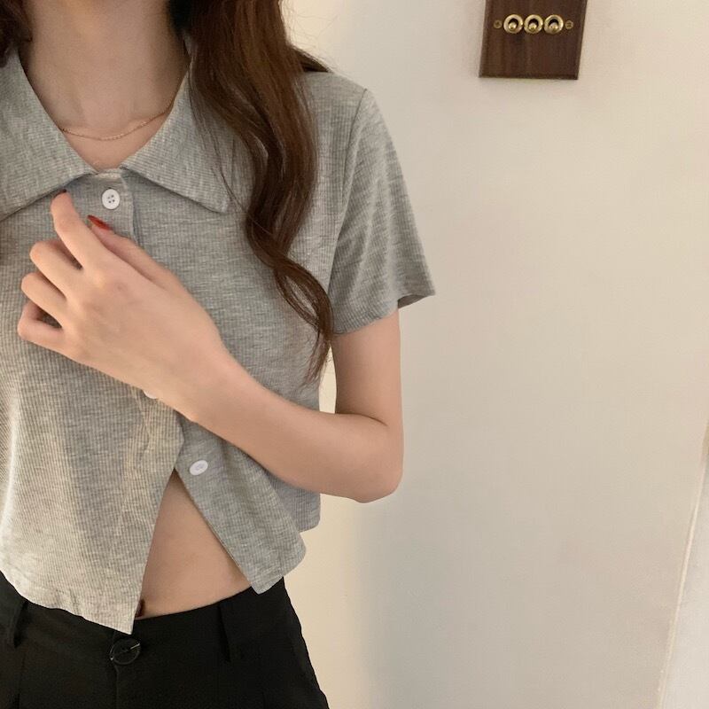バックルクロップドトップス 夏服カラースリットスリムハイウェストウェスト半袖スリーブTシャツレディース ショート ハーフスリーブ 夏物 ウエスト Marchs44542920572