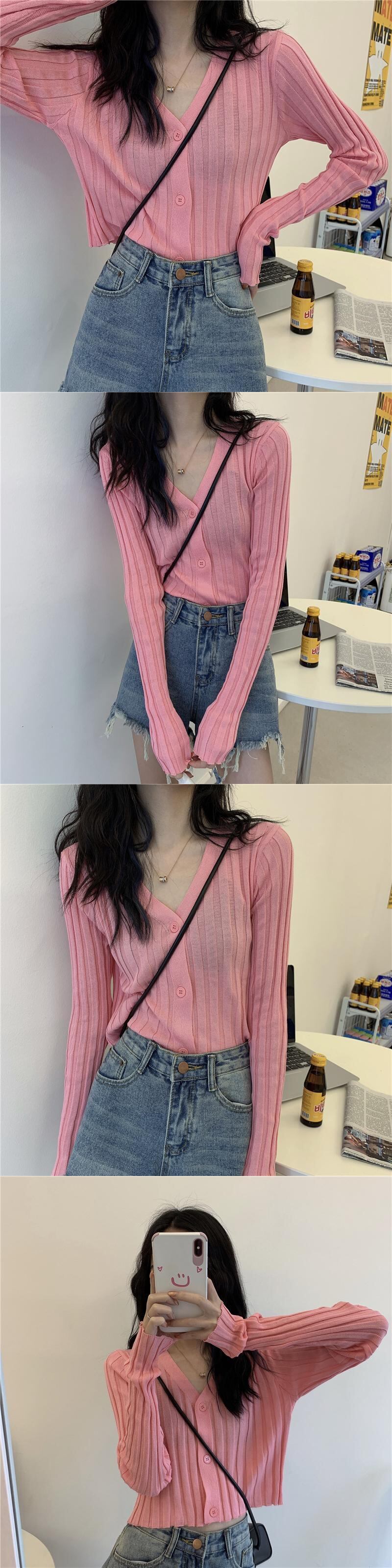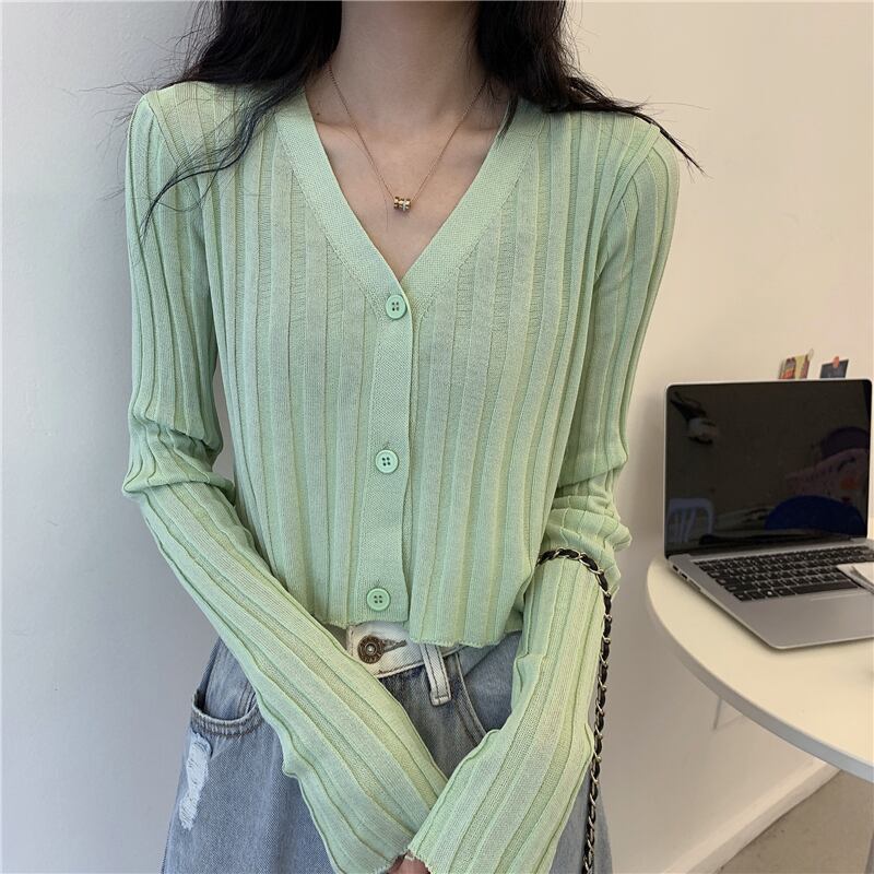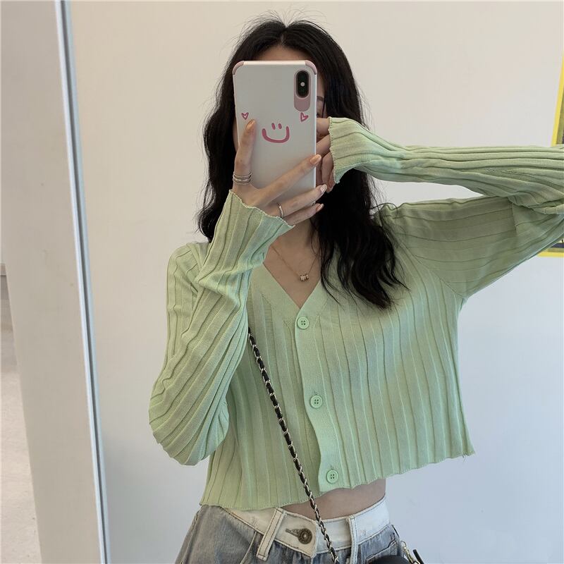 Vネックショートクロップドトップス ハイウェスト夏服薄手ニットカーディガン 夏物 シルク ウエスト Marchs73063454312