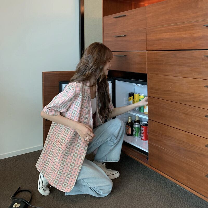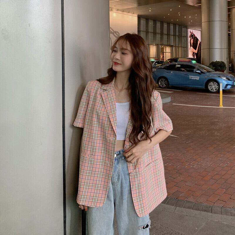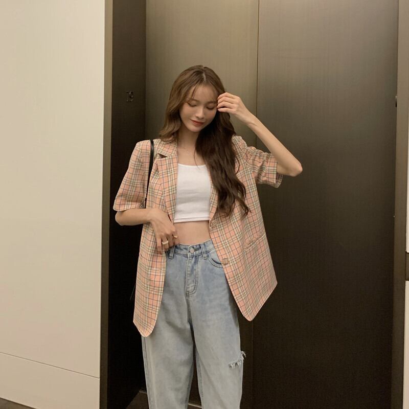 格子柄ジャケット 夏服韓国ファッションスタイルルーズカジュアルトップス 夏物 ミドル丈 Marchs64086421166