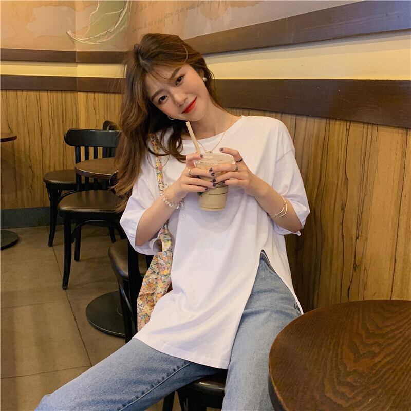 サイドスリットホワイトTシャツ夏服トップス 大人ガーリー スウィート キュート カジュアル 夏物 ミドル丈 Marchs23836653906