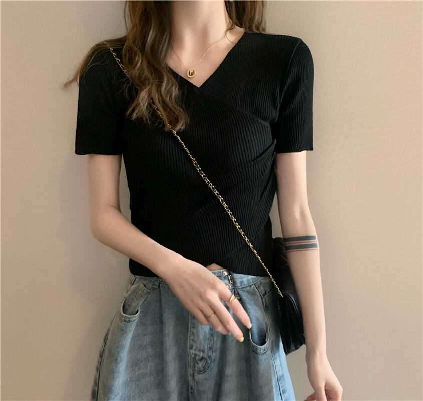 トップス トレンドスリムクロスVネックニットショートTシャツ 大人ガーリー スウィート キュート カジュアル Marchs56966925