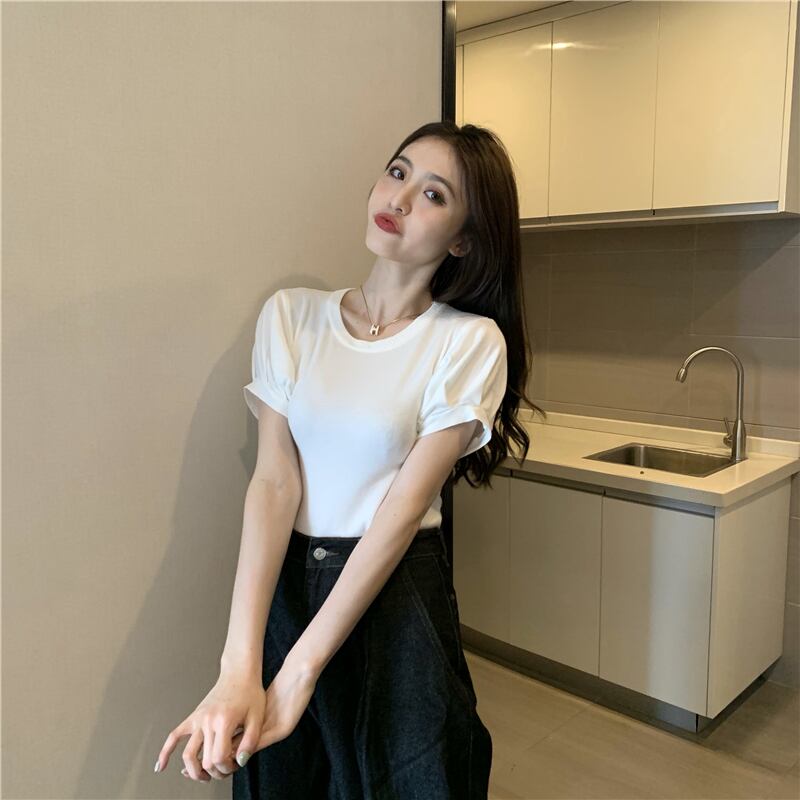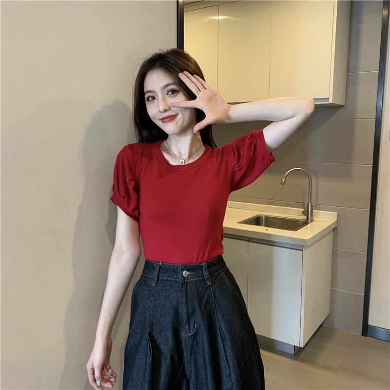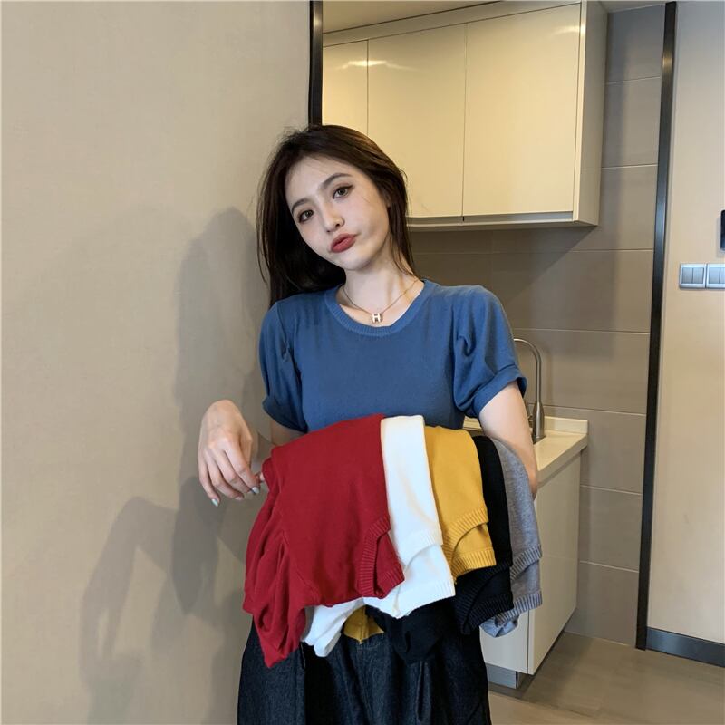 ラウンドネックホワイトスリーブトップス 夏服スリム薄手セーター 夏物 Oネック シルク Marchs31013654926