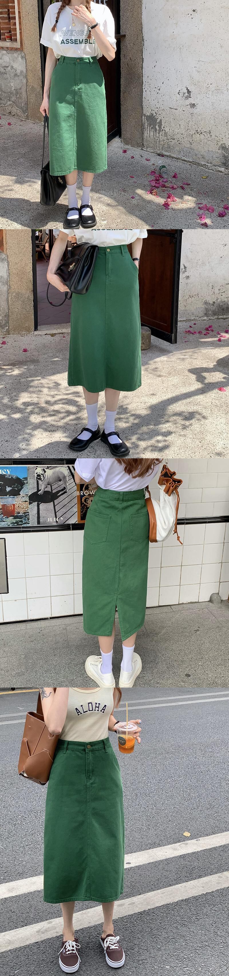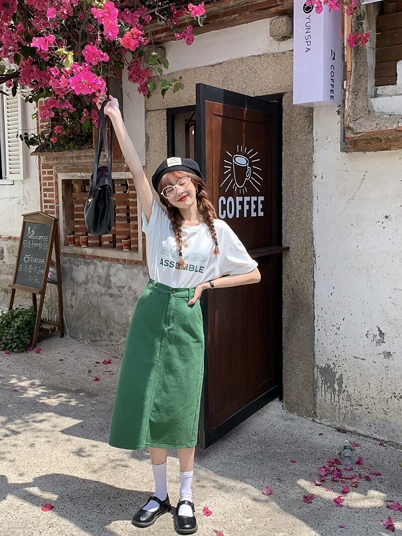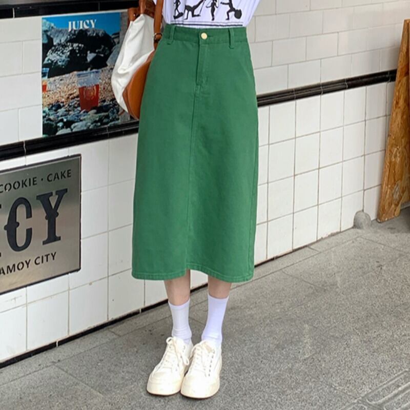 韓国ファッションスタンダードグリーンスカート ロングレディース夏服薄手ハイウェストウェスト レトロ 夏物 スタイル ウエスト Marchs71148467293