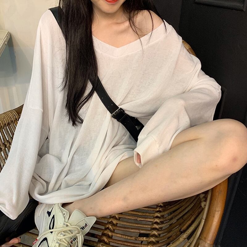 夏服ホワイトゆったりシャツ ニットTシャツルーズ薄手 ロング 夏物 シルク 長袖 Marchs71632091097