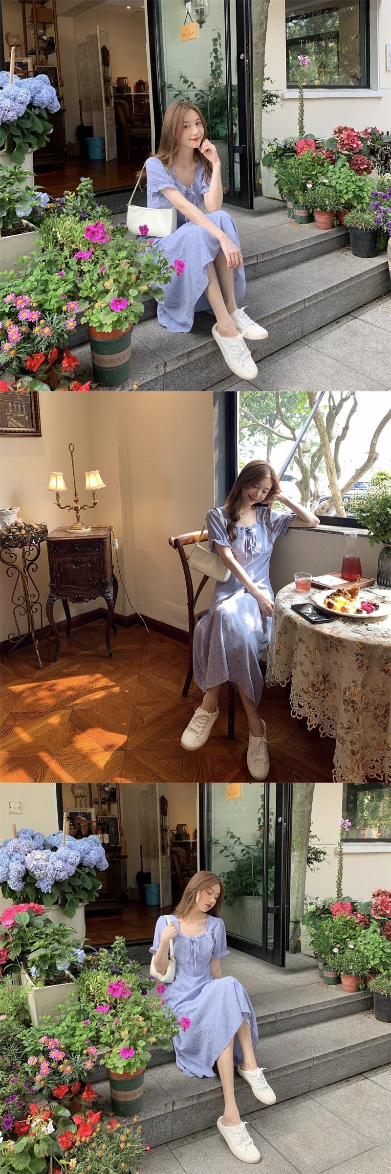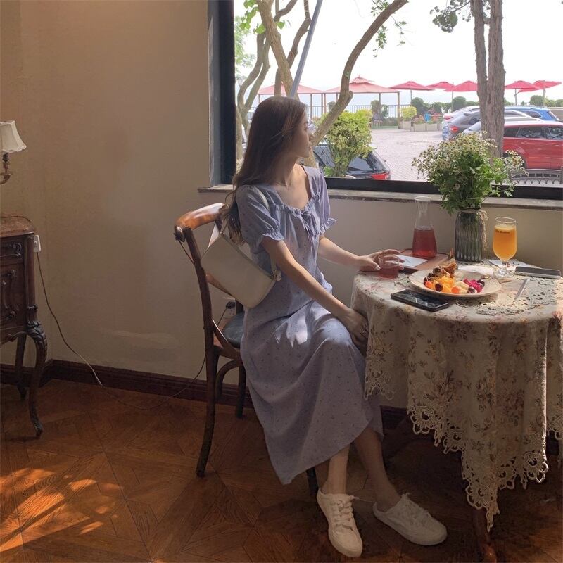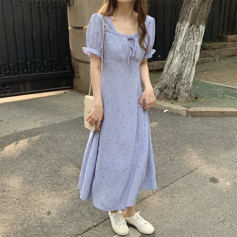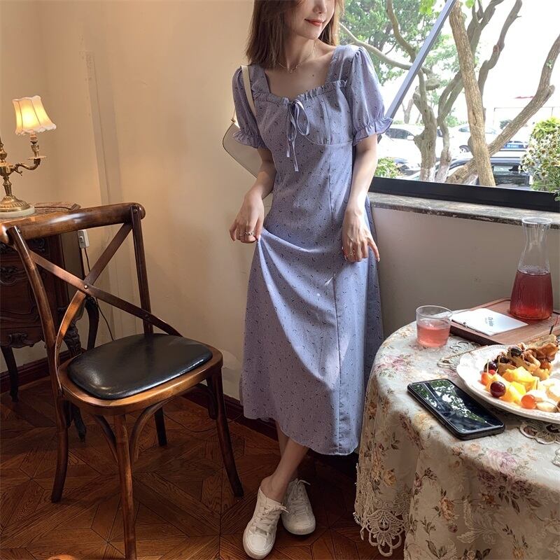 夏服レディーススカート スタンダードロングスリーブフローラルワンピース レトロ 夏物 花柄 フラワーデザイン パープル スクウェア Marchs46459651077