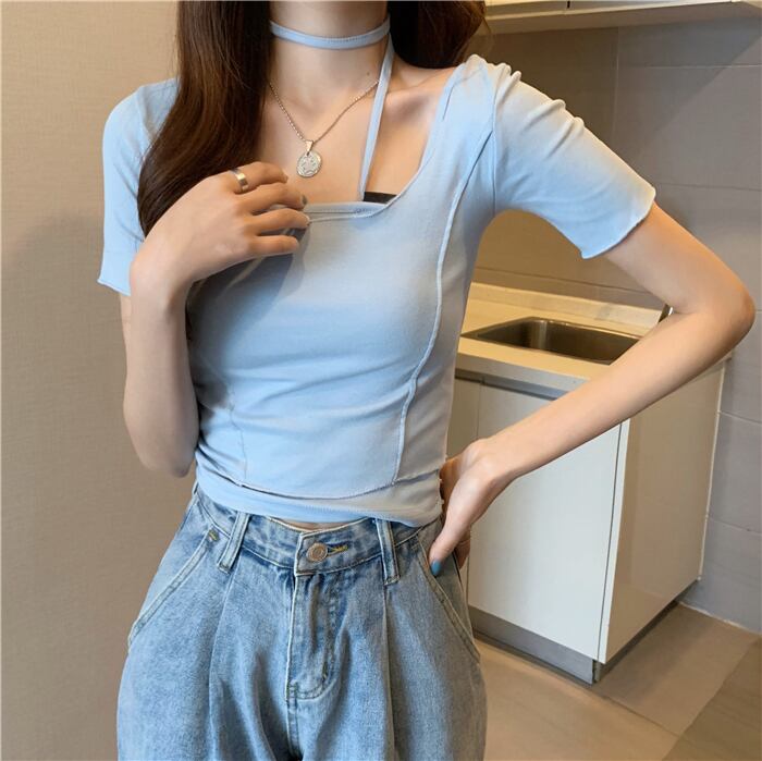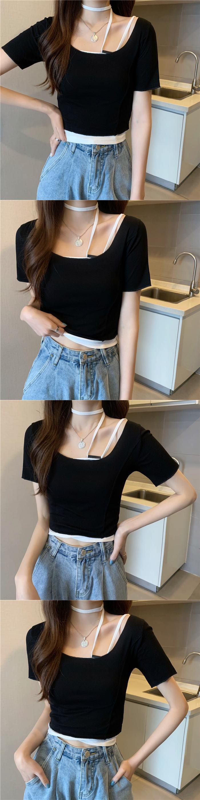 ブラックショートTシャツレディース夏服スタイルスリムトップス ハイウェストウェストパンツ 夏物 ウエスト Marchs35344594996