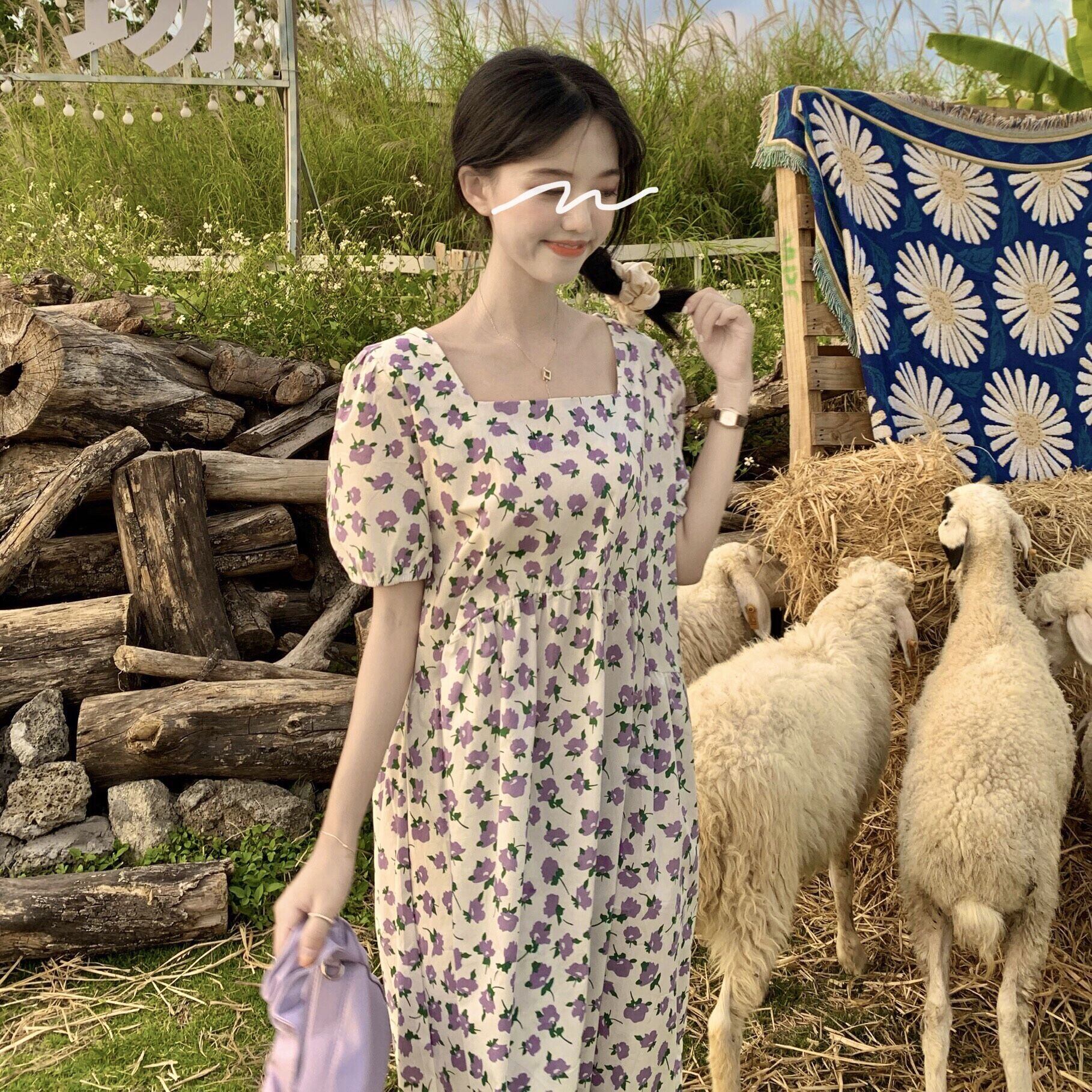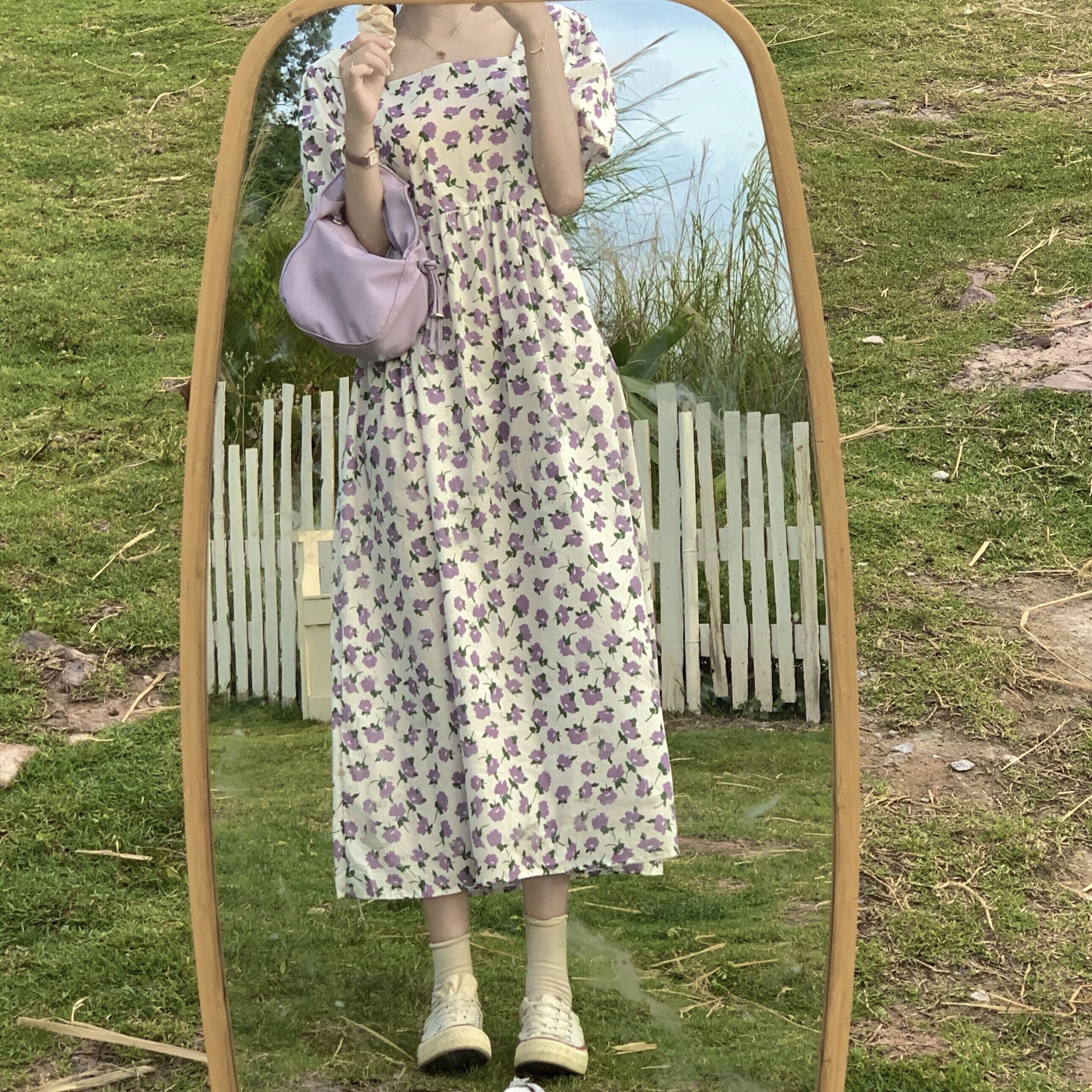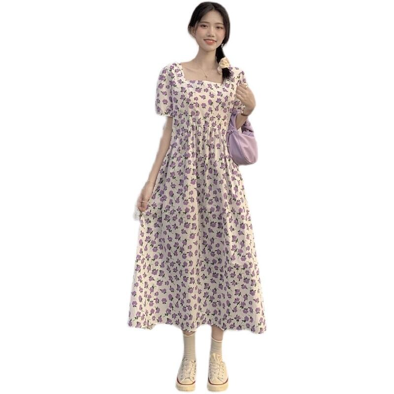 フローラルスカート ロング夏服ホルターカラースリーブワンピース 夏物 花柄 パープル スクウェア Marchs85162993678