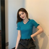 ウェストVネックショートトップス 夏服ブラック薄手ニット半袖スリーブTシャツトレンド ハーフスリーブ 大人ガーリー スウィート キュート カジュアル 夏物 ウエスト Marchs17913755364