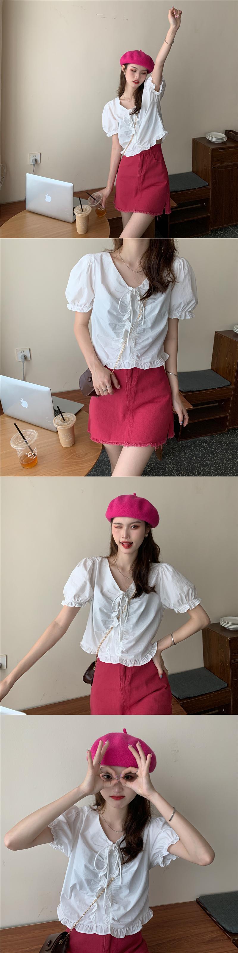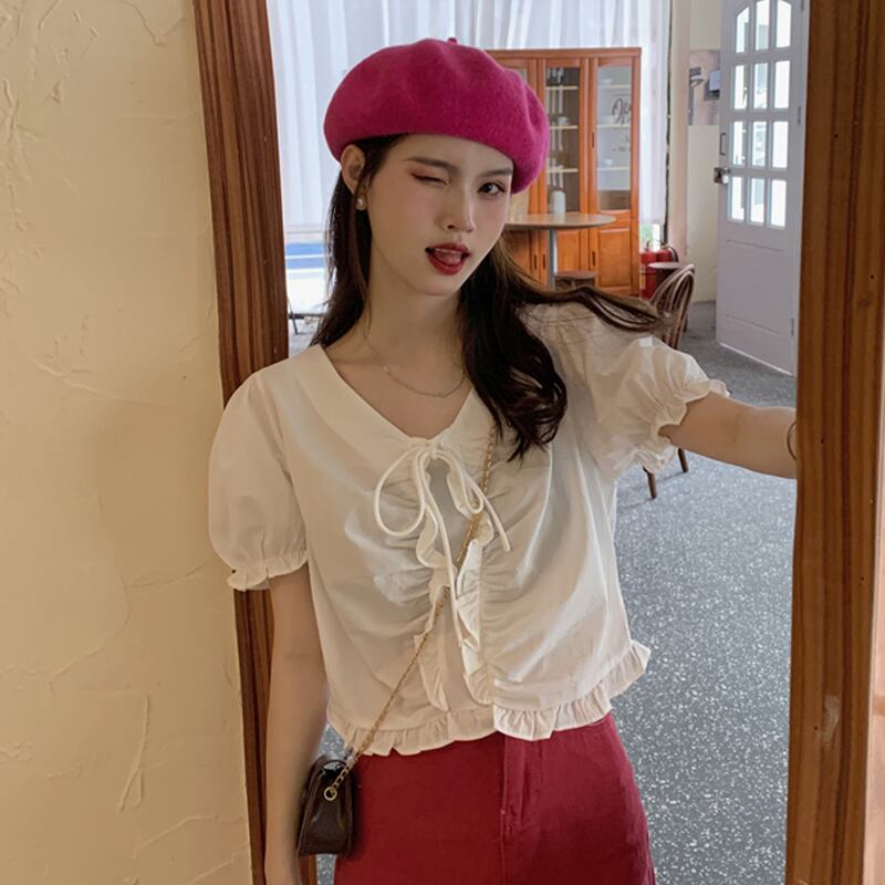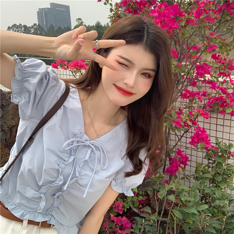 Vネックショートスリーブシャツ 夏服薄手韓国ファッションスタイルトップス 夏物 Marchs66079009849