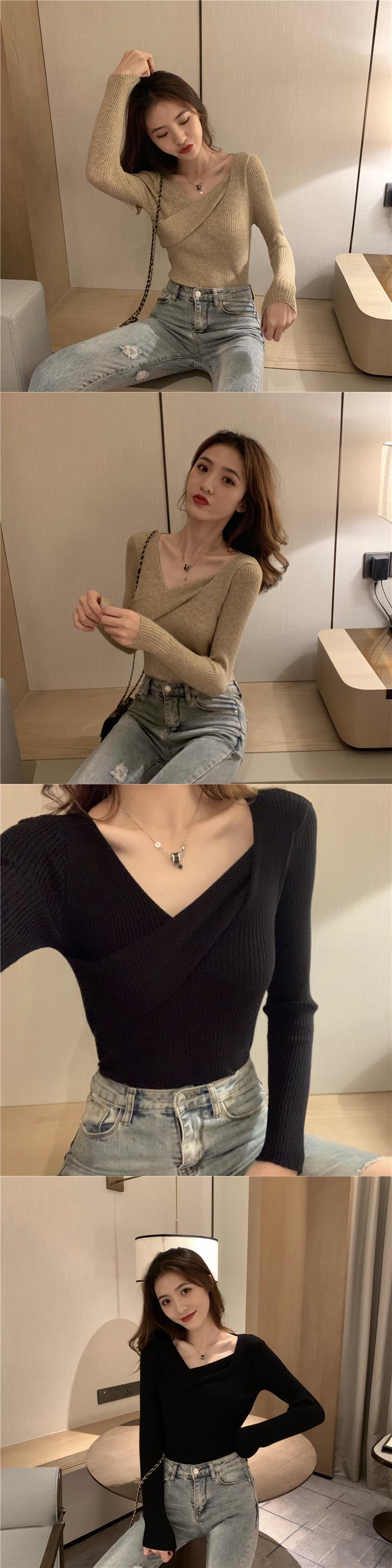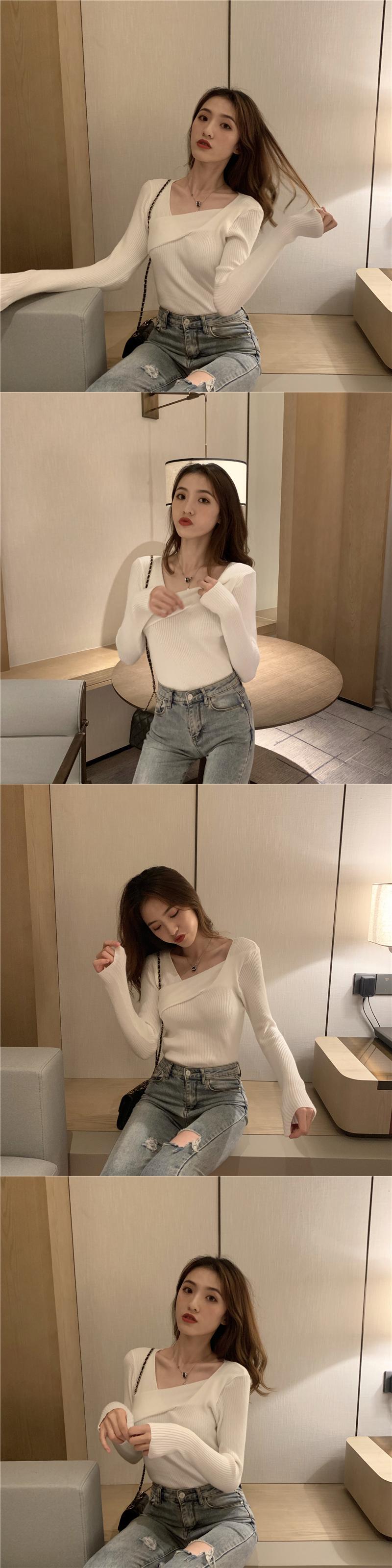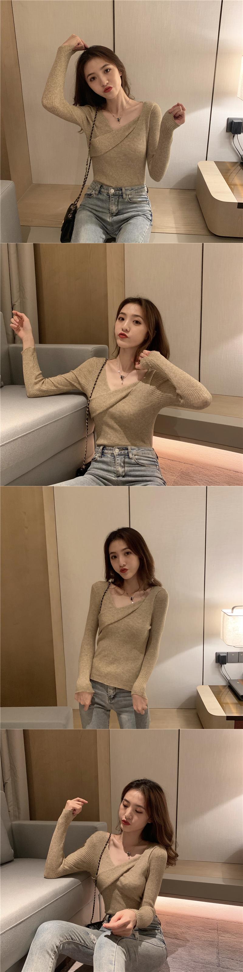 ホワイトゆったりシャツ スプリングVネックトップス 秋物スタイルスリムニットセーター 春物 オータム Marchs91854780574