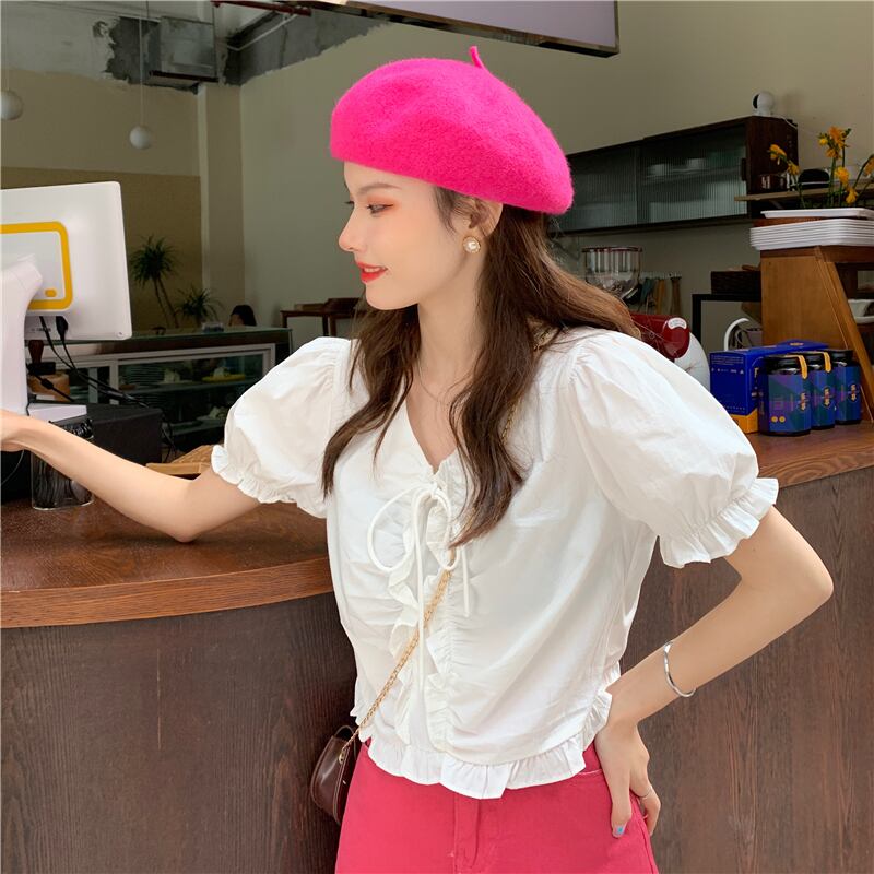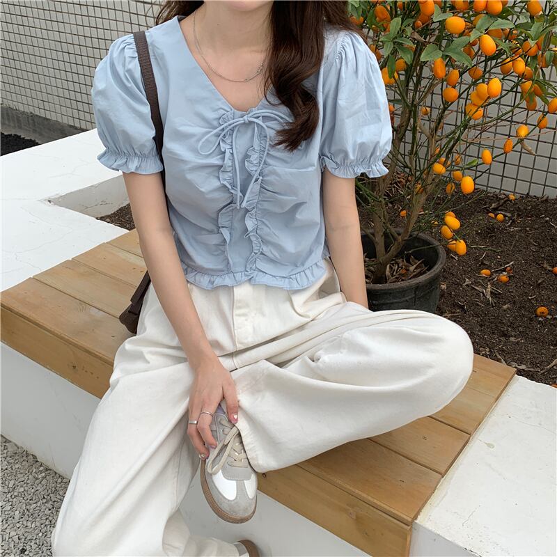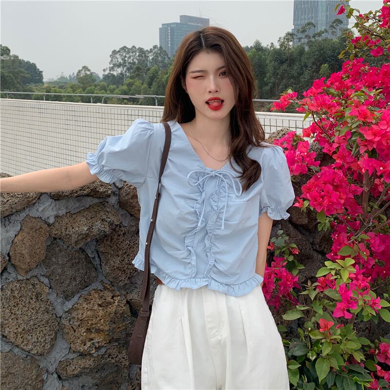 ブルーシャツ ショートスリーブレディース夏服Vネックトレンドトップス 夏物 Marchs73628154260